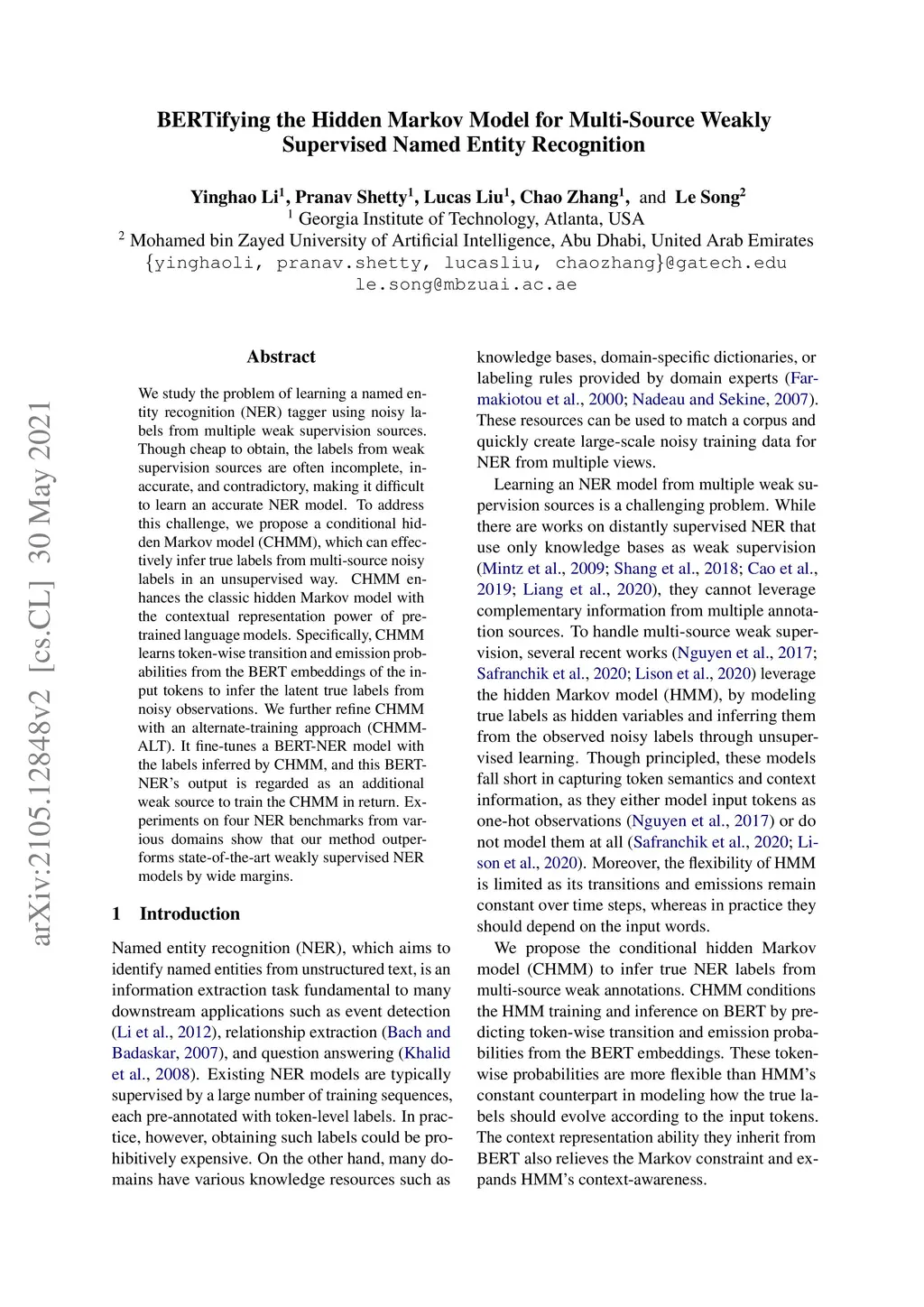 We study the problem of learning a named entity recognition (NER) model using noisy la-bels from multiple weak supervision sources. Though cheaper than human annotators, weak sources usually yield incomplete, inaccurate, or contradictory predictions. To address such challenges, we propose a conditional hidden Markov model (CHMM). It inherits the hidden Markov model's ability to aggregating the labels from weak sources through unsupervised learning. However, CHMM enhances the hidden Markov model's flexibility and context representation capability by predicting token-wise transition and emission probabilities from the BERT embeddings of the input tokens. In addition, we refine CHMM's prediction with an alternate-training approach (CHMM-AlT). It fine-tunes a BERT-based NER model with the labels inferred by CHMM, and this BERT-NER's output is regarded as an additional weak source to train the CHMM in return. Evaluation on four datasets from various domains shows that our method is superior to the weakly super-vised baselines by a wide margin.
