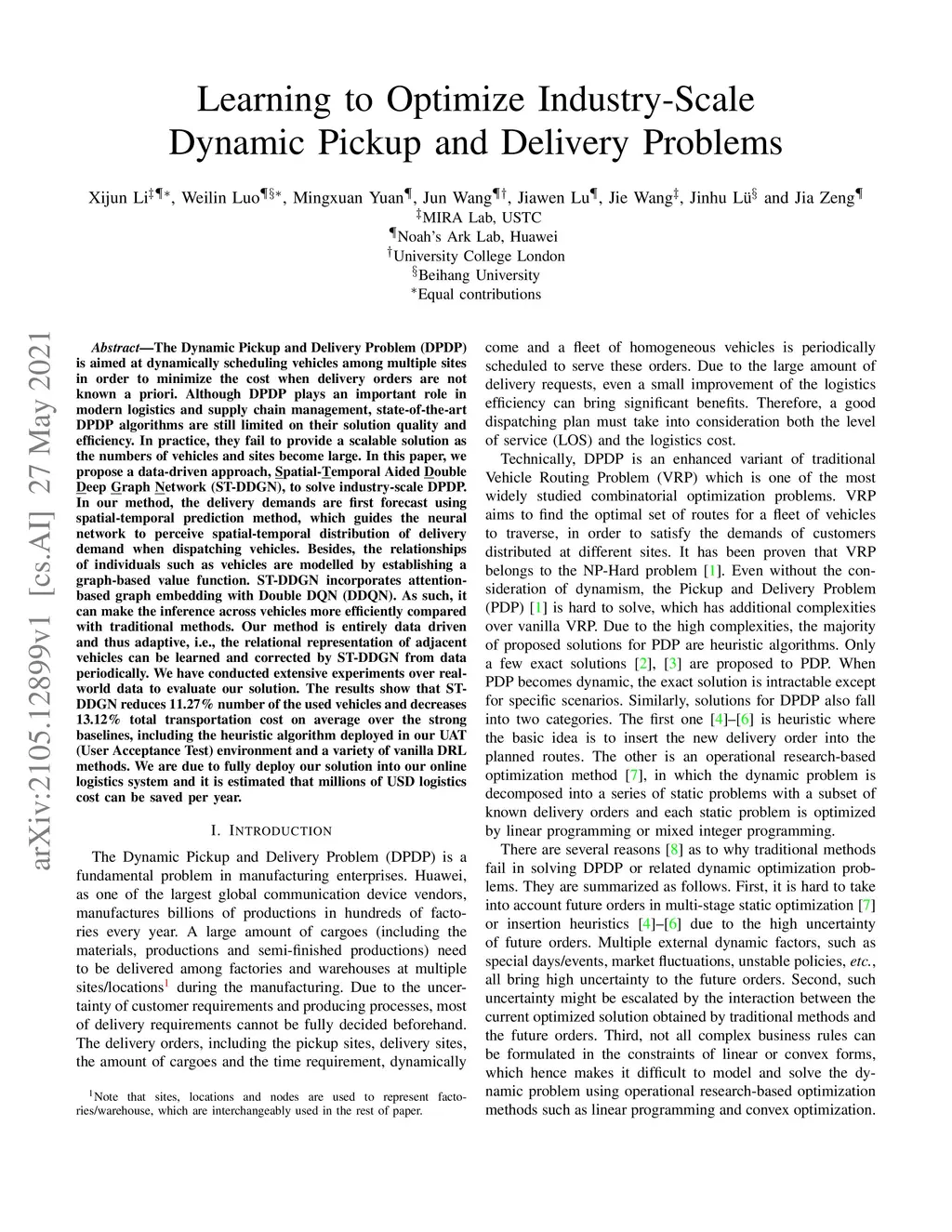 The Dynamic Pickup and Delivery Problem (DPDP) is aimed at dynamically scheduling vehicles among multiple sites in order to minimize the cost when delivery orders are not known a priori. Although DPDP plays an important role in modern logistics and supply chain management, state-of-the-art DPDP algorithms are still limited on their solution quality and efficiency. In practice, they fail to provide a scalable solution as the numbers of vehicles and sites become large. In this paper, we propose a data-driven approach, Spatial-Temporal Aided Double Deep Graph Network (ST-DDGN), to solve industry-scale DPDP. In our method, the delivery demands are first forecast using spatial-temporal prediction method, which guides the neural network to perceive spatial-temporal distribution of delivery demand when dispatching vehicles. Besides, the relationships of individuals such as vehicles are modelled by establishing a graph-based value function. ST-DDGN incorporates attention-based graph embedding with Double DQN (DDQN). As such, it can make the inference across vehicles more efficiently compared with traditional methods. Our method is entirely data driven and thus adaptive, i.e., the relational representation of adjacent vehicles can be learned and corrected by ST-DDGN from data periodically. We have conducted extensive experiments over real-world data to evaluate our solution. The results show that ST-DDGN reduces 11.27% number of the used vehicles and decreases 13.12% total transportation cost on average over the strong baselines, including the heuristic algorithm deployed in our UAT (User Acceptance Test) environment and a variety of vanilla DRL methods. We are due to fully deploy our solution into our online logistics system and it is estimated that millions of USD logistics cost can be saved per year.