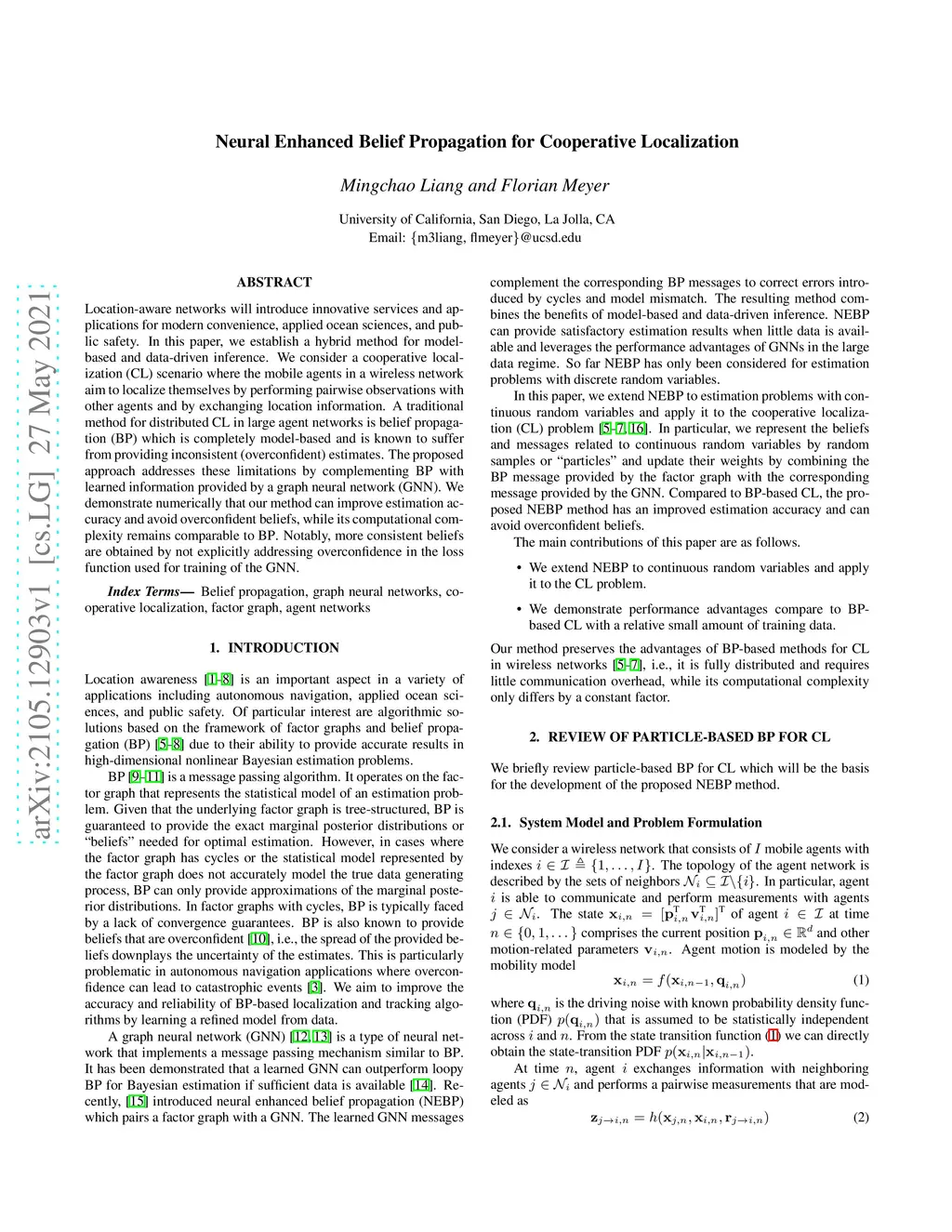 Location-aware networks will introduce innovative services and applications for modern convenience, applied ocean sciences, and public safety. In this paper, we establish a hybrid method for model-based and data-driven inference. We consider a cooperative localization (CL) scenario where the mobile agents in a wireless network aim to localize themselves by performing pairwise observations with other agents and by exchanging location information. A traditional method for distributed CL in large agent networks is belief propagation (BP) which is completely model-based and is known to suffer from providing inconsistent (overconfident) estimates. The proposed approach addresses these limitations by complementing BP with learned information provided by a graph neural network (GNN). We demonstrate numerically that our method can improve estimation accuracy and avoid overconfident beliefs, while its computational complexity remains comparable to BP. Notably, more consistent beliefs are obtained by not explicitly addressing overconfidence in the loss function used for training of the GNN.