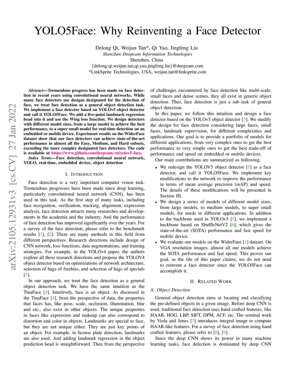 Tremendous progress has been made on face detection in recent years using convolutional neural networks. While many face detectors use designs designated for detecting faces, we treat face detection as a generic object detection task. We implement a face detector based on the YOLOv5 object detector and call it YOLO5Face. We make a few key modifications to the YOLOv5 and optimize it for face detection. These modifications include adding a five-point landmark regression head, using a stem block at the input of the backbone, using smaller-size kernels in the SPP, and adding a P6 output in the PAN block. We design detectors of different model sizes, from an extra-large model to achieve the best performance to a super small model for real-time detection on an embedded or mobile device. Experiment results on the WiderFace dataset show that on VGA images, our face detectors can achieve state-of-the-art performance in almost all the Easy, Medium, and Hard subsets, exceeding the more complex designated face detectors. The code is available at \url{https://github.com/deepcam-cn/yolov5-face}