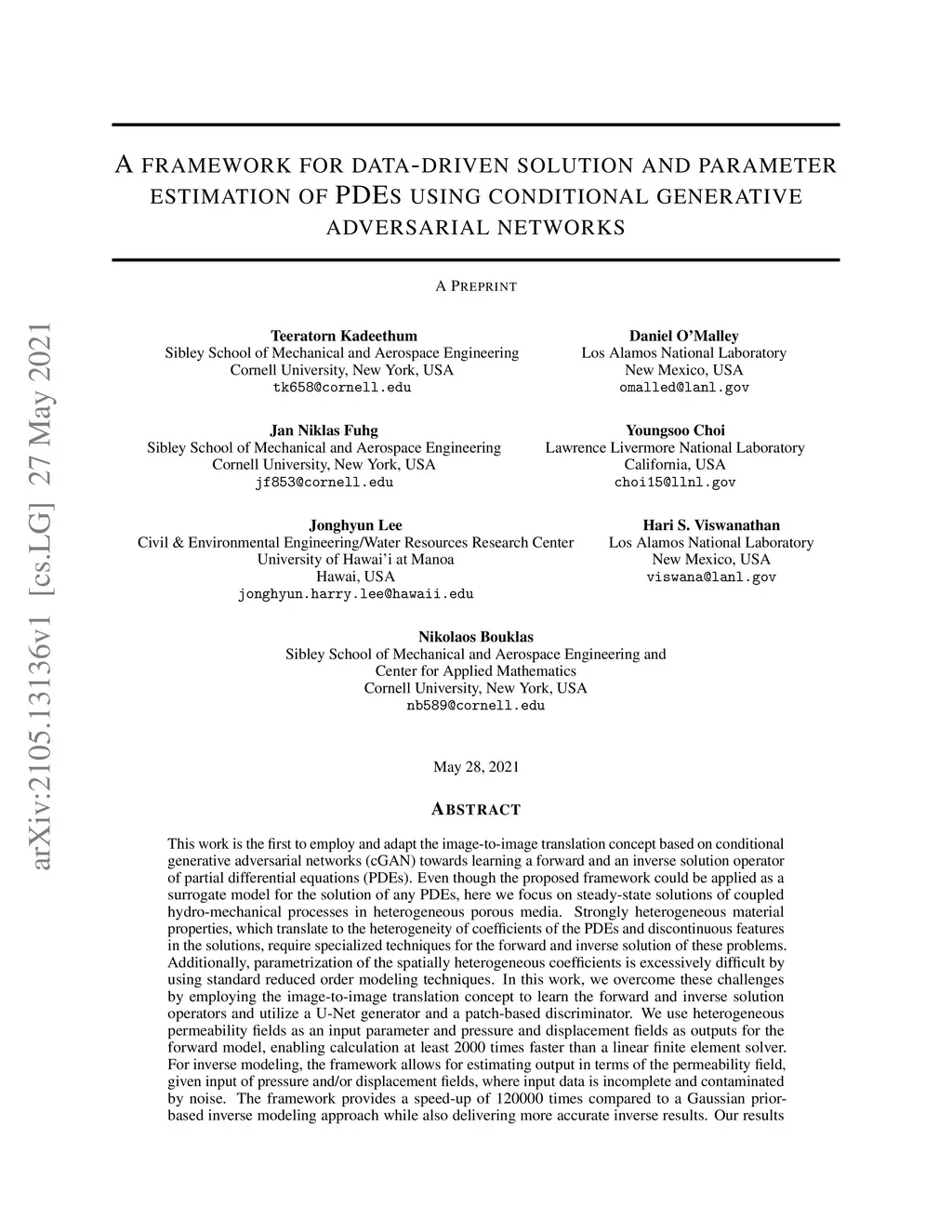 This work is the first to employ and adapt the image-to-image translation concept based on conditional generative adversarial networks (cGAN) towards learning a forward and an inverse solution operator of partial differential equations (PDEs). Even though the proposed framework could be applied as a surrogate model for the solution of any PDEs, here we focus on steady-state solutions of coupled hydro-mechanical processes in heterogeneous porous media. Strongly heterogeneous material properties, which translate to the heterogeneity of coefficients of the PDEs and discontinuous features in the solutions, require specialized techniques for the forward and inverse solution of these problems. Additionally, parametrization of the spatially heterogeneous coefficients is excessively difficult by using standard reduced order modeling techniques. In this work, we overcome these challenges by employing the image-to-image translation concept to learn the forward and inverse solution operators and utilize a U-Net generator and a patch-based discriminator. Our results show that the proposed data-driven reduced order model has competitive predictive performance capabilities in accuracy and computational efficiency as well as training time requirements compared to state-of-the-art data-driven methods for both forward and inverse problems.