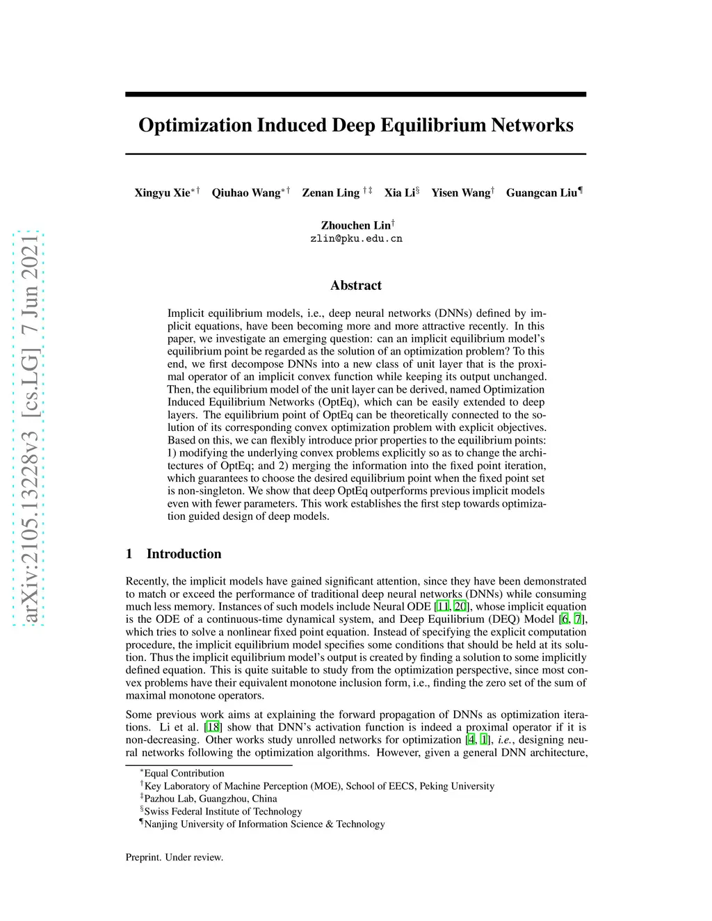 Implicit equilibrium models, i.e., deep neural networks (DNNs) defined by implicit equations, have been becoming more and more attractive recently. In this paper, we investigate an emerging question: can an implicit equilibrium model's equilibrium point be regarded as the solution of an optimization problem? To this end, we first decompose DNNs into a new class of unit layer that is the proximal operator of an implicit convex function while keeping its output unchanged. Then, the equilibrium model of the unit layer can be derived, named Optimization Induced Equilibrium Networks (OptEq), which can be easily extended to deep layers. The equilibrium point of OptEq can be theoretically connected to the solution of its corresponding convex optimization problem with explicit objectives. Based on this, we can flexibly introduce prior properties to the equilibrium points: 1) modifying the underlying convex problems explicitly so as to change the architectures of OptEq; and 2) merging the information into the fixed point iteration, which guarantees to choose the desired equilibrium point when the fixed point set is non-singleton. We show that deep OptEq outperforms previous implicit models even with fewer parameters. This work establishes the first step towards the optimization-guided design of deep models.