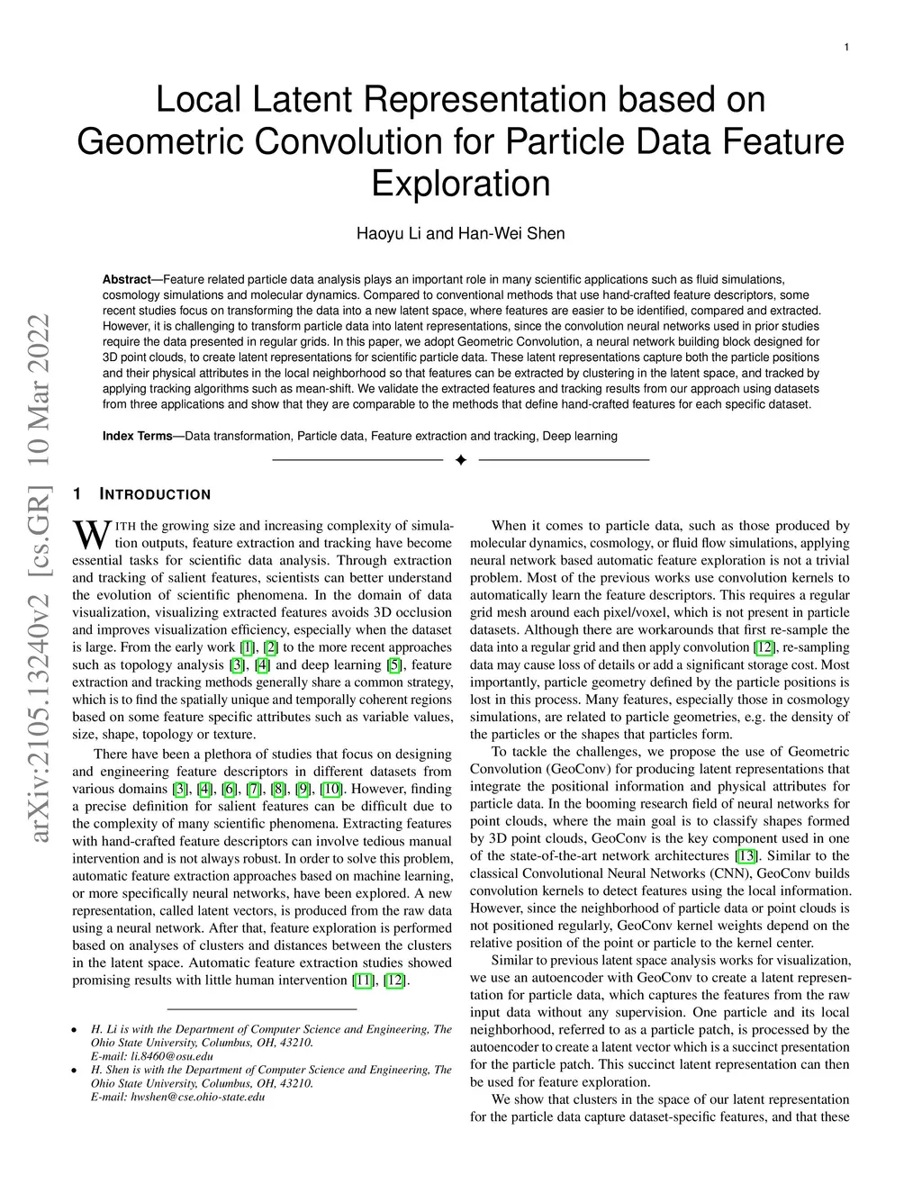 Feature related particle data analysis plays an important role in many scientific applications such as fluid simulations, cosmology simulations and molecular dynamics. Compared to conventional methods that use hand-crafted feature descriptors, some recent studies focus on transforming the data into a new latent space, where features are easier to be identified, compared and extracted. However, it is challenging to transform particle data into latent representations, since the convolution neural networks used in prior studies require the data presented in regular grids. In this paper, we adopt Geometric Convolution, a neural network building block designed for 3D point clouds, to create latent representations for scientific particle data. These latent representations capture both the particle positions and their physical attributes in the local neighborhood so that features can be extracted by clustering in the latent space, and tracked by applying tracking algorithms such as mean-shift. We validate the extracted features and tracking results from our approach using datasets from three applications and show that they are comparable to the methods that define hand-crafted features for each specific dataset.