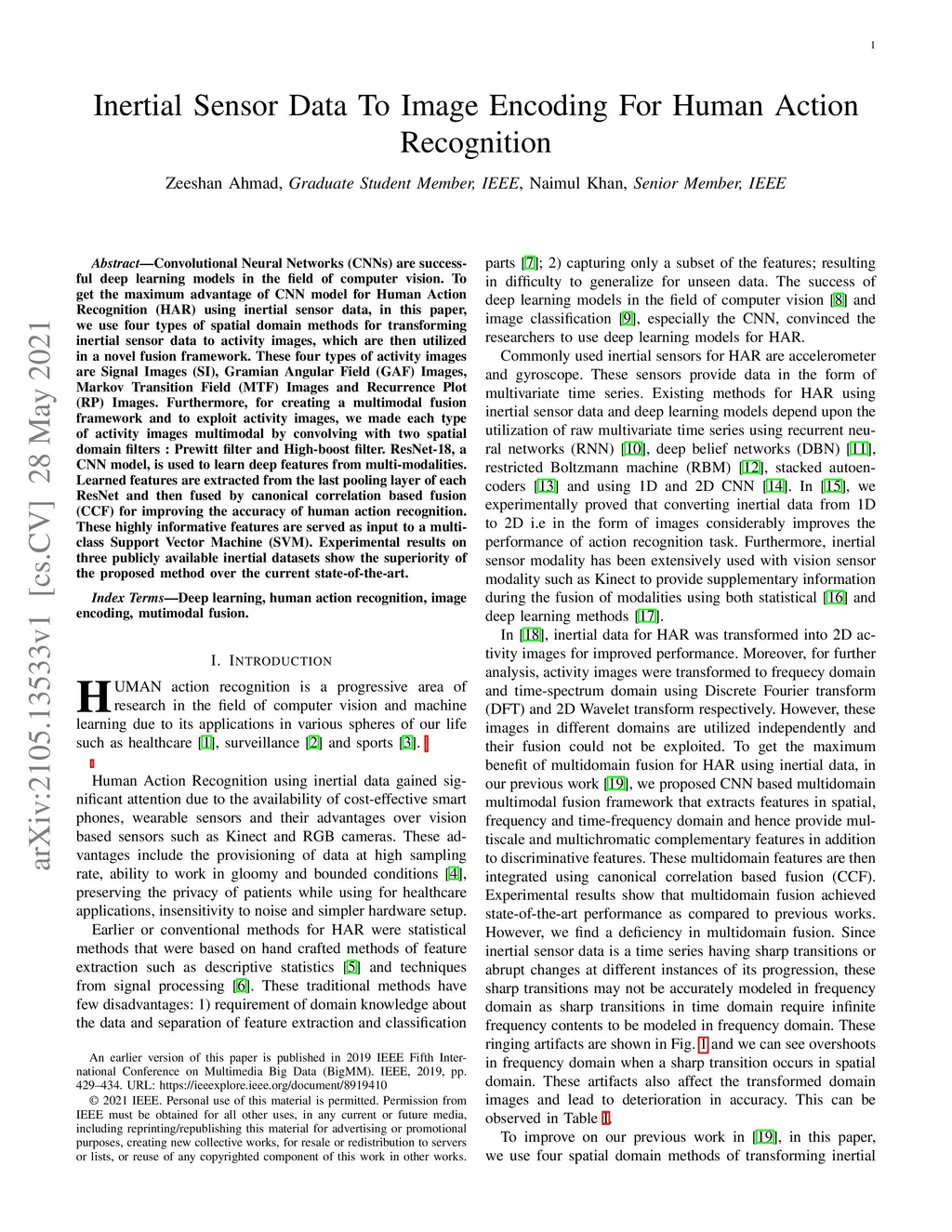 Inertial Sensor Data To Image Encoding For Human Action Recognition