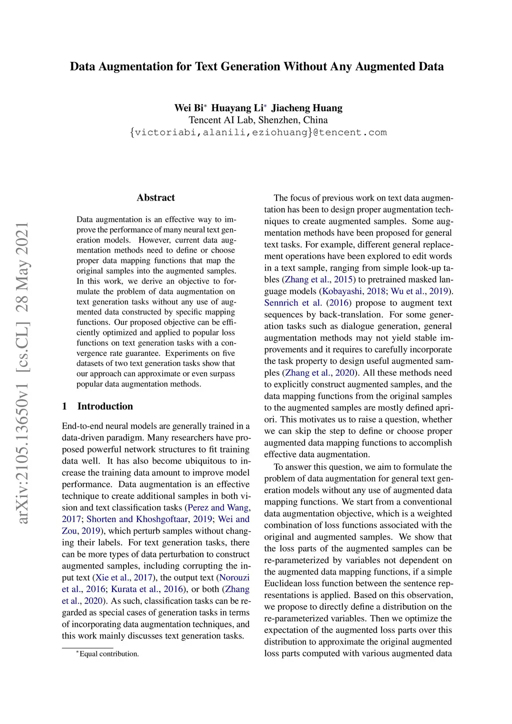 Data augmentation is an effective way to improve the performance of many neural text generation models. However, current data augmentation methods need to define or choose proper data mapping functions that map the original samples into the augmented samples. In this work, we derive an objective to formulate the problem of data augmentation on text generation tasks without any use of augmented data constructed by specific mapping functions. Our proposed objective can be efficiently optimized and applied to popular loss functions on text generation tasks with a convergence rate guarantee. Experiments on five datasets of two text generation tasks show that our approach can approximate or even surpass popular data augmentation methods.