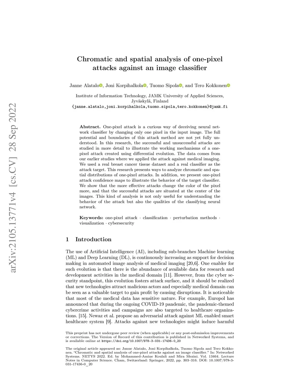 Chromatic and spatial analysis of one-pixel attacks against an image