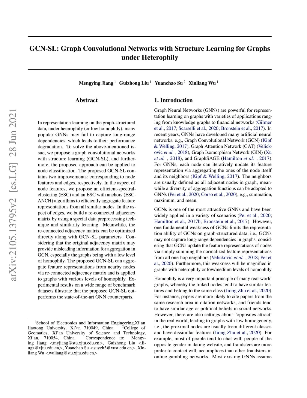 In representation learning on the graph-structured data, under heterophily (or low homophily), many popular GNNs may fail to capture long-range dependencies, which leads to their performance degradation. To solve the above-mentioned issue, we propose a graph convolutional networks with structure learning (GCN-SL), and furthermore, the proposed approach can be applied to node classification. The proposed GCN-SL contains two improvements: corresponding to node features and edges, respectively. In the aspect of node features, we propose an efficient-spectral-clustering (ESC) and an ESC with anchors (ESC-ANCH) algorithms to efficiently aggregate feature representations from all similar nodes. In the aspect of edges, we build a re-connected adjacency matrix by using a special data preprocessing technique and similarity learning, and the re-connected adjacency matrix can be optimized directly along with GCN-SL parameters. Considering that the original adjacency matrix may provide misleading information for aggregation in GCN, especially the graphs being with a low level of homophily. The proposed GCN-SL can aggregate feature representations from nearby nodes via re-connected adjacency matrix and is applied to graphs with various levels of homophily. Experimental results on a wide range of benchmark datasets illustrate that the proposed GCN-SL outperforms the stateof-the-art GNN counterparts.