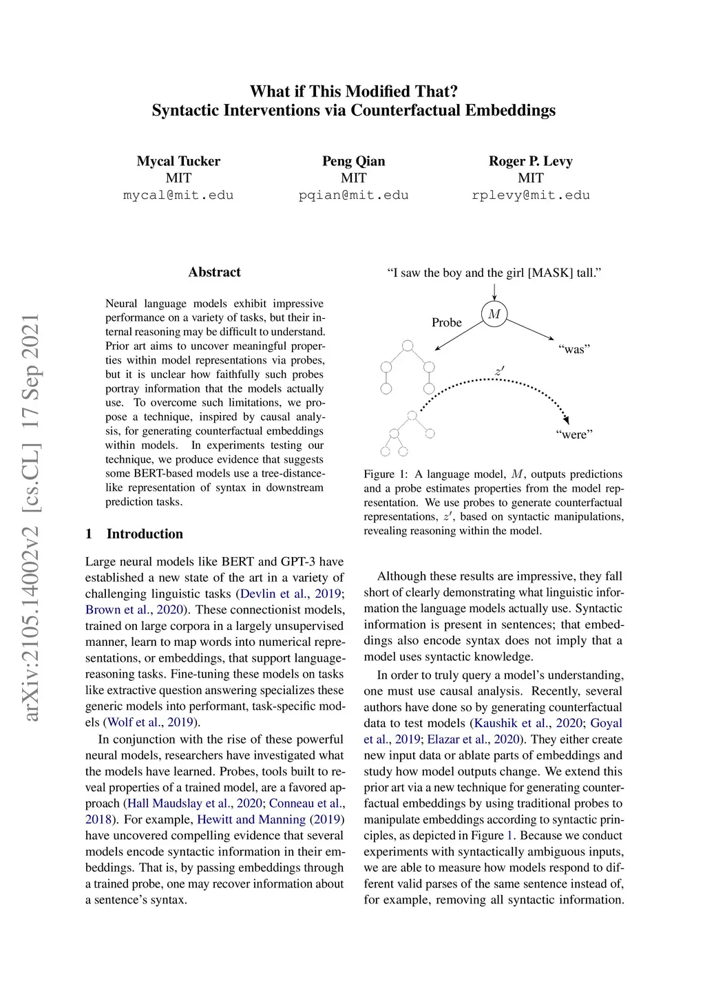 Neural language models exhibit impressive performance on a variety of tasks, but their internal reasoning may be difficult to understand. Prior art aims to uncover meaningful properties within model representations via probes, but it is unclear how faithfully such probes portray information that the models actually use. To overcome such limitations, we propose a technique, inspired by causal analysis, for generating counterfactual embeddings within models. In experiments testing our technique, we produce evidence that suggests some BERT-based models use a tree-distance-like representation of syntax in downstream prediction tasks.