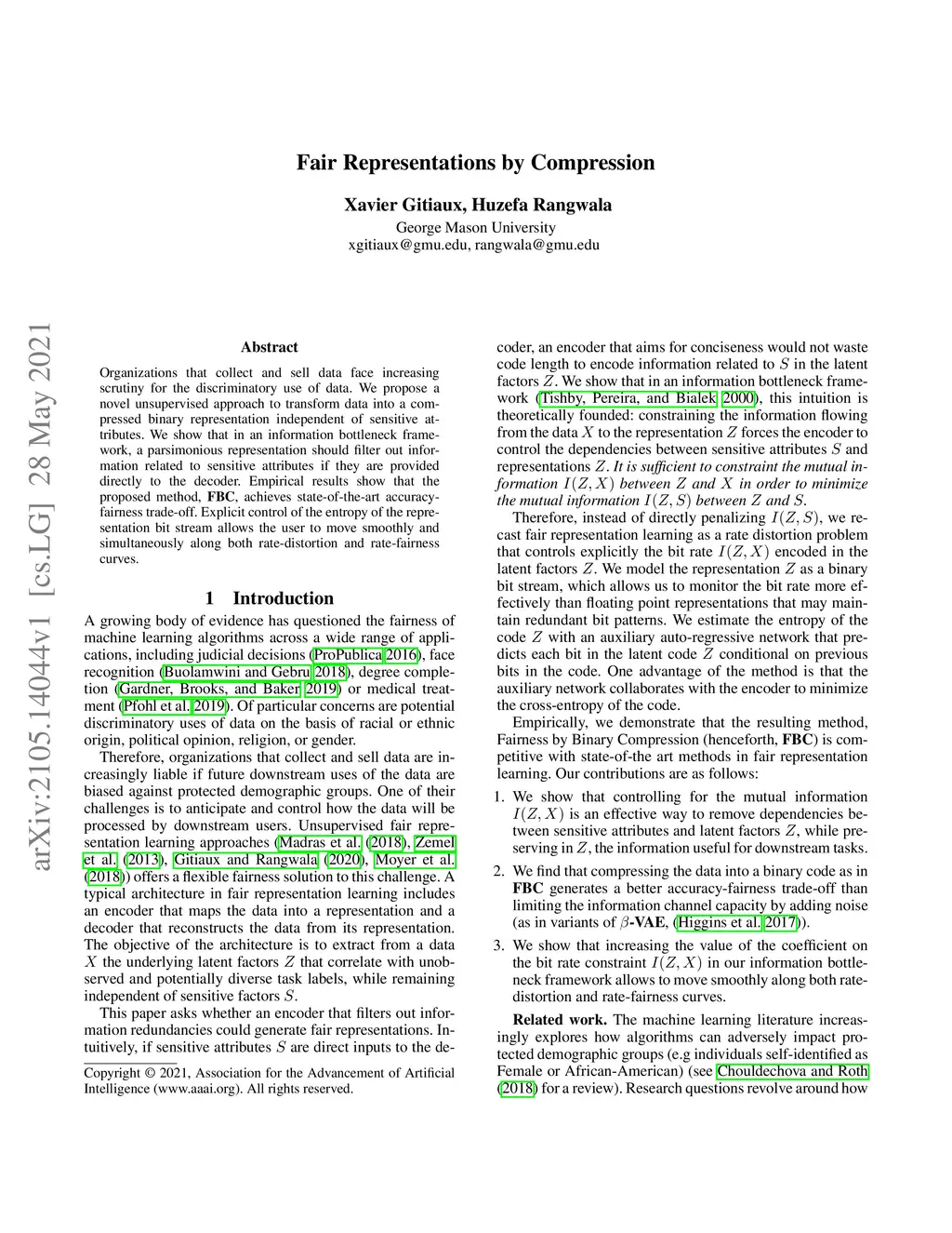 Organizations that collect and sell data face increasing scrutiny for the discriminatory use of data. We propose a novel unsupervised approach to transform data into a compressed binary representation independent of sensitive attributes. We show that in an information bottleneck framework, a parsimonious representation should filter out information related to sensitive attributes if they are provided directly to the decoder. Empirical results show that the proposed method, \textbf{FBC}, achieves state-of-the-art accuracy-fairness trade-off. Explicit control of the entropy of the representation bit stream allows the user to move smoothly and simultaneously along both rate-distortion and rate-fairness curves. \end{abstract}
