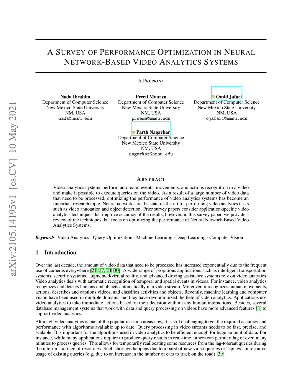 Video analytics systems perform automatic events, movements, and actions recognition in a video and make it possible to execute queries on the video. As a result of a large number of video data that need to be processed, optimizing the performance of video analytics systems has become an important research topic. Neural networks are the state-of-the-art for performing video analytics tasks such as video annotation and object detection. Prior survey papers consider application-specific video analytics techniques that improve accuracy of the results; however, in this survey paper, we provide a review of the techniques that focus on optimizing the performance of Neural Network-Based Video Analytics Systems.