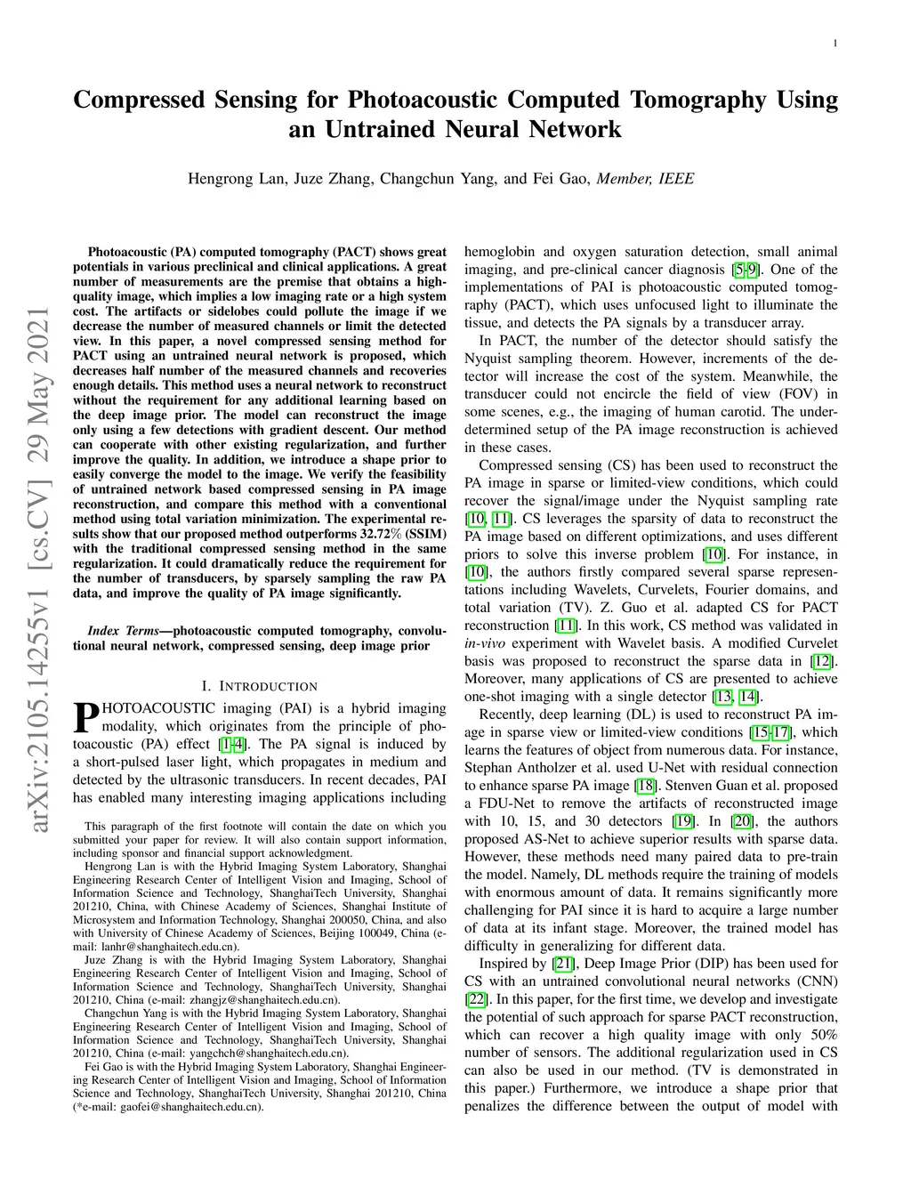 Photoacoustic (PA) computed tomography (PACT) shows great potentials in various preclinical and clinical applications. A great number of measurements are the premise that obtains a high-quality image, which implies a low imaging rate or a high system cost. The artifacts or sidelobes could pollute the image if we decrease the number of measured channels or limit the detected view. In this paper, a novel compressed sensing method for PACT using an untrained neural network is proposed, which decreases half number of the measured channels and recoveries enough details. This method uses a neural network to reconstruct without the requirement for any additional learning based on the deep image prior. The model can reconstruct the image only using a few detections with gradient descent. Our method can cooperate with other existing regularization, and further improve the quality. In addition, we introduce a shape prior to easily converge the model to the image. We verify the feasibility of untrained network based compressed sensing in PA image reconstruction, and compare this method with a conventional method using total variation minimization. The experimental results show that our proposed method outperforms 32.72% (SSIM) with the traditional compressed sensing method in the same regularization. It could dramatically reduce the requirement for the number of transducers, by sparsely sampling the raw PA data, and improve the quality of PA image significantly.