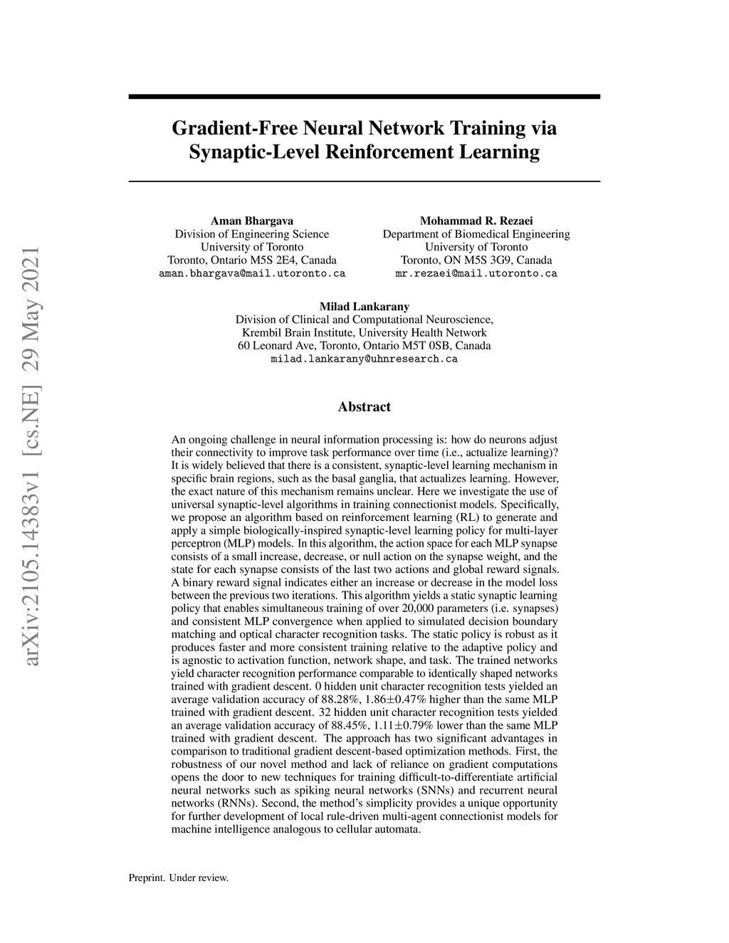 An ongoing challenge in neural information processing is: how do neurons adjust their connectivity to improve task performance over time (i.e., actualize learning)? It is widely believed that there is a consistent, synaptic-level learning mechanism in specific brain regions that actualizes learning. However, the exact nature of this mechanism remains unclear. Here we propose an algorithm based on reinforcement learning (RL) to generate and apply a simple synaptic-level learning policy for multi-layer perceptron (MLP) models. In this algorithm, the action space for each MLP synapse consists of a small increase, decrease, or null action on the synapse weight, and the state for each synapse consists of the last two actions and reward signals. A binary reward signal indicates improvement or deterioration in task performance. The static policy produces superior training relative to the adaptive policy and is agnostic to activation function, network shape, and task. Trained MLPs yield character recognition performance comparable to identically shaped networks trained with gradient descent. 0 hidden unit character recognition tests yielded an average validation accuracy of 88.28%, 1.860.47% higher than the same MLP trained with gradient descent. 32 hidden unit character recognition tests yielded an average validation accuracy of 88.45%, 1.110.79% lower than the same MLP trained with gradient descent. The robustness and lack of reliance on gradient computations opens the door for new techniques for training difficult-to-differentiate artificial neural networks such as spiking neural networks (SNNs) and recurrent neural networks (RNNs). Further, the method's simplicity provides a unique opportunity for further development of local rule-driven multi-agent connectionist models for machine intelligence analogous to cellular automata.
