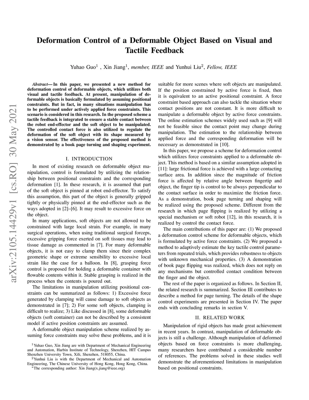 In this paper, we presented a new method for deformation control of deformable objects, which utilizes both visual and tactile feedback. At present, manipulation of deformable objects is basically formulated by assuming positional constraints. But in fact, in many situations manipulation has to be performed under actively applied force constraints. This scenario is considered in this research. In the proposed scheme a tactile feedback is integrated to ensure a stable contact between the robot end-effector and the soft object to be manipulated. The controlled contact force is also utilized to regulate the deformation of the soft object with its shape measured by a vision sensor. The effectiveness of the proposed method is demonstrated by a book page turning and shaping experiment.