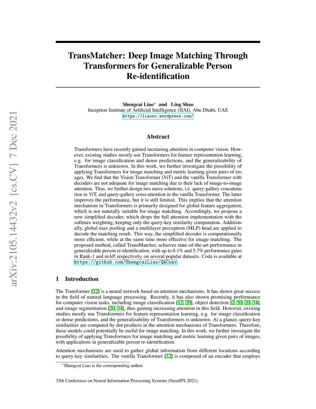 Transformers have recently gained increasing attention in computer vision. However, existing studies mostly use Transformers for feature representation learning, e.g. for image classification and dense predictions, and the generalizability of Transformers is unknown. In this work, we further investigate the possibility of applying Transformers for image matching and metric learning given pairs of images. We find that the Vision Transformer (ViT) and the vanilla Transformer with decoders are not adequate for image matching due to their lack of image-to-image attention. Thus, we further design two naive solutions, i.e. query-gallery concatenation in ViT, and query-gallery cross-attention in the vanilla Transformer. The latter improves the performance, but it is still limited. This implies that the attention mechanism in Transformers is primarily designed for global feature aggregation, which is not naturally suitable for image matching. Accordingly, we propose a new simplified decoder, which drops the full attention implementation with the softmax weighting, keeping only the query-key similarity computation. Additionally, global max pooling and a multilayer perceptron (MLP) head are applied to decode the matching result. This way, the simplified decoder is computationally more efficient, while at the same time more effective for image matching. The proposed method, called TransMatcher, achieves state-of-the-art performance in generalizable person re-identification, with up to 6.1% and 5.7% performance gains in Rank-1 and mAP, respectively, on several popular datasets. Code is available at https://github.com/ShengcaiLiao/QAConv.