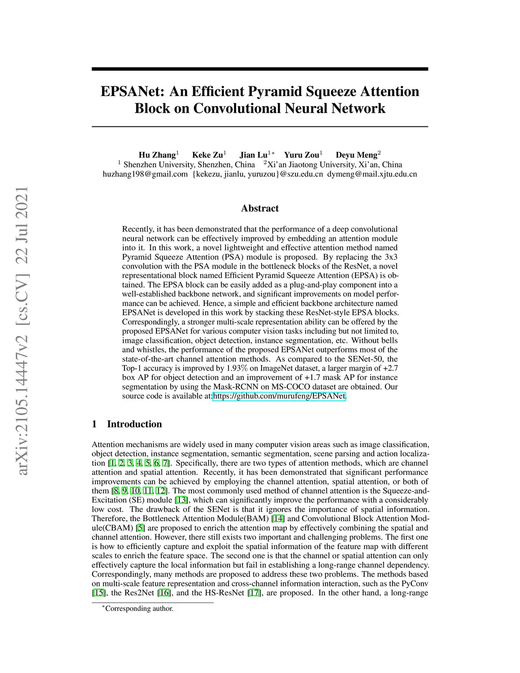 EPSANet: An Efficient Pyramid Squeeze Attention Block on Convolutional