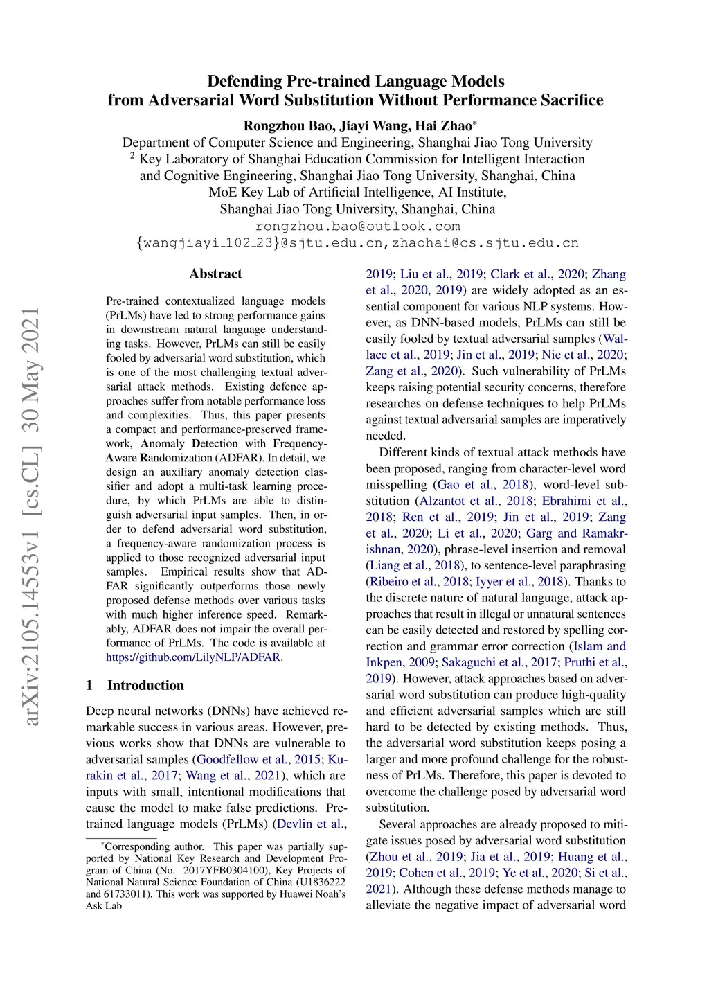 Pre-trained contextualized language models (PrLMs) have led to strong performance gains in downstream natural language understanding tasks. However, PrLMs can still be easily fooled by adversarial word substitution, which is one of the most challenging textual adversarial attack methods. Existing defence approaches suffer from notable performance loss and complexities. Thus, this paper presents a compact and performance-preserved framework, Anomaly Detection with Frequency-Aware Randomization (ADFAR). In detail, we design an auxiliary anomaly detection classifier and adopt a multi-task learning procedure, by which PrLMs are able to distinguish adversarial input samples. Then, in order to defend adversarial word substitution, a frequency-aware randomization process is applied to those recognized adversarial input samples. Empirical results show that ADFAR significantly outperforms those newly proposed defense methods over various tasks with much higher inference speed. Remarkably, ADFAR does not impair the overall performance of PrLMs. The code is available at https://github.com/LilyNLP/ADFAR