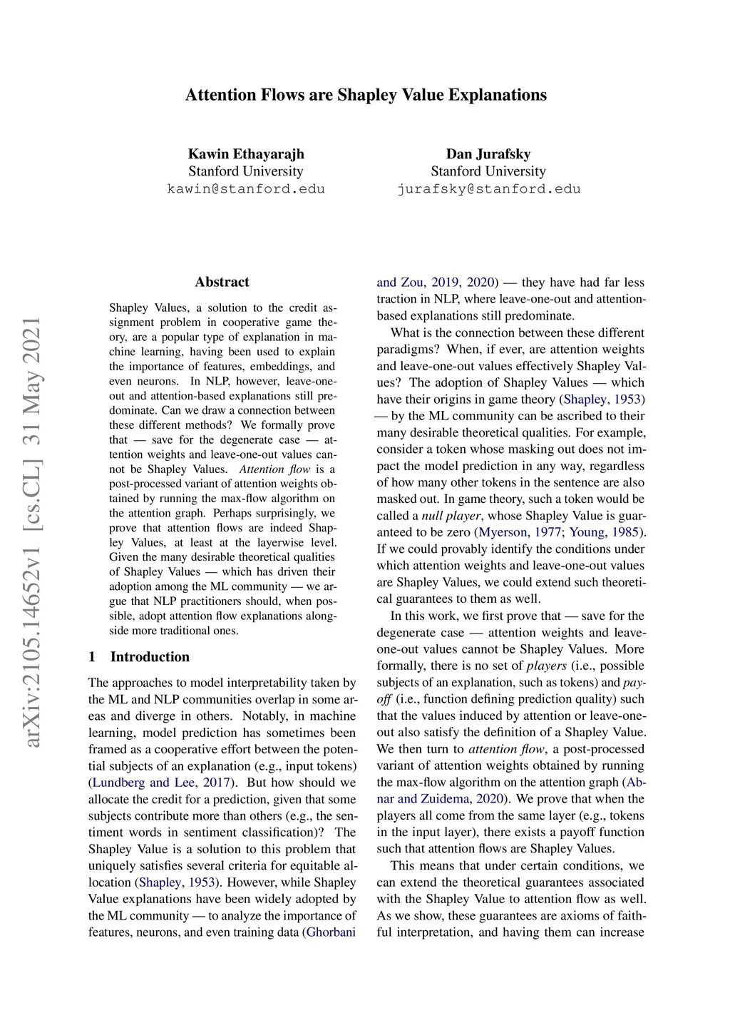 Shapley Values, a solution to the credit assignment problem in cooperative game theory, are a popular type of explanation in machine learning, having been used to explain the importance of features, embeddings, and even neurons. In NLP, however, leave-one-out and attention-based explanations still predominate. Can we draw a connection between these different methods? We formally prove that -- save for the degenerate case -- attention weights and leave-one-out values cannot be Shapley Values. is a post-processed variant of attention weights obtained by running the max-flow algorithm on the attention graph. Perhaps surprisingly, we prove that attention flows are indeed Shapley Values, at least at the layerwise level. Given the many desirable theoretical qualities of Shapley Values -- which has driven their adoption among the ML community -- we argue that NLP practitioners should, when possible, adopt attention flow explanations alongside more traditional ones.