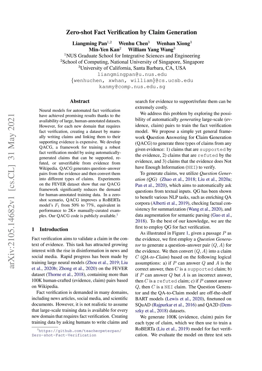 Zero-shot Fact Verification by Claim Generation