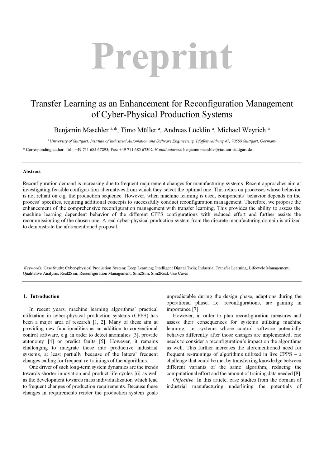 Reconfiguration demand is increasing due to frequent requirement changes for manufacturing systems. Recent approaches aim at investigating feasible configuration alternatives from which they select the optimal one. This relies on processes whose behavior is not reliant on e.g. the production sequence. However, when machine learning is used, components' behavior depends on the process' specifics, requiring additional concepts to successfully conduct reconfiguration management. Therefore, we propose the enhancement of the comprehensive reconfiguration management with transfer learning. This provides the ability to assess the machine learning dependent behavior of the different CPPS configurations with reduced effort and further assists the recommissioning of the chosen one. A real cyber-physical production system from the discrete manufacturing domain is utilized to demonstrate the aforementioned proposal.