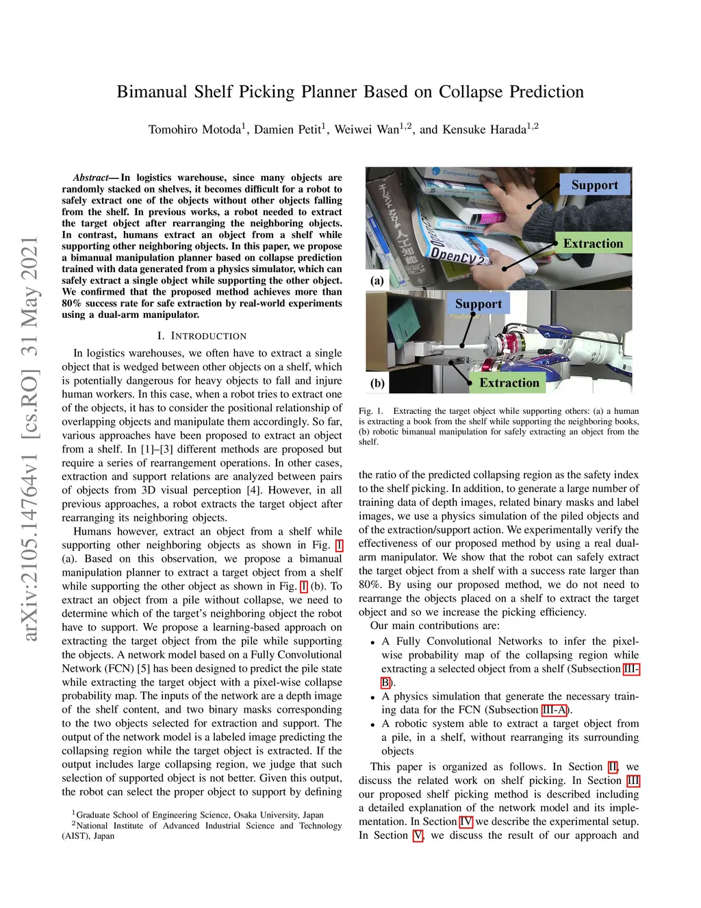 Bimanual Shelf Picking Planner Based on Collapse Prediction