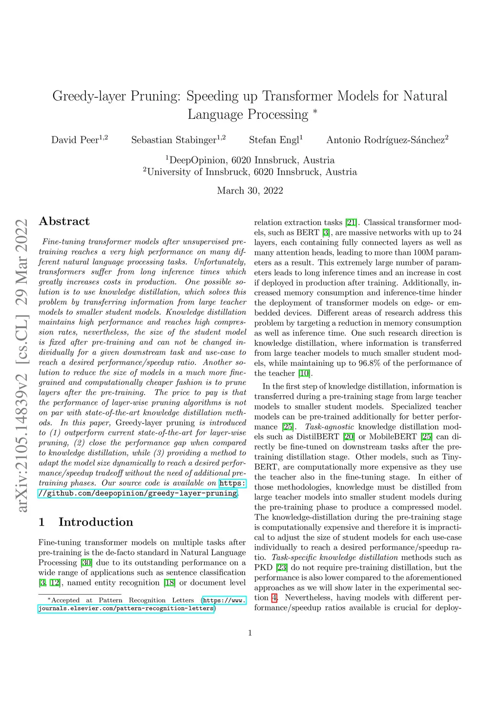 Fine-tuning transformer models after unsupervised pre-training reaches a very high performance on many different natural language processing tasks. Unfortunately, transformers suffer from long inference times which greatly increases costs in production. One possible solution is to use knowledge distillation, which solves this problem by transferring information from large teacher models to smaller student models. Knowledge distillation maintains high performance and reaches high compression rates, nevertheless, the size of the student model is fixed after pre-training and can not be changed individually for a given downstream task and use-case to reach a desired performance/speedup ratio. Another solution to reduce the size of models in a much more fine-grained and computationally cheaper fashion is to prune layers after the pre-training. The price to pay is that the performance of layer-wise pruning algorithms is not on par with state-of-the-art knowledge distillation methods. In this paper, Greedy-layer pruning is introduced to (1) outperform current state-of-the-art for layer-wise pruning, (2) close the performance gap when compared to knowledge distillation, while (3) providing a method to adapt the model size dynamically to reach a desired performance/speedup tradeoff without the need of additional pre-training phases. Our source code is available on https://github.com/deepopinion/greedy-layer-pruning.