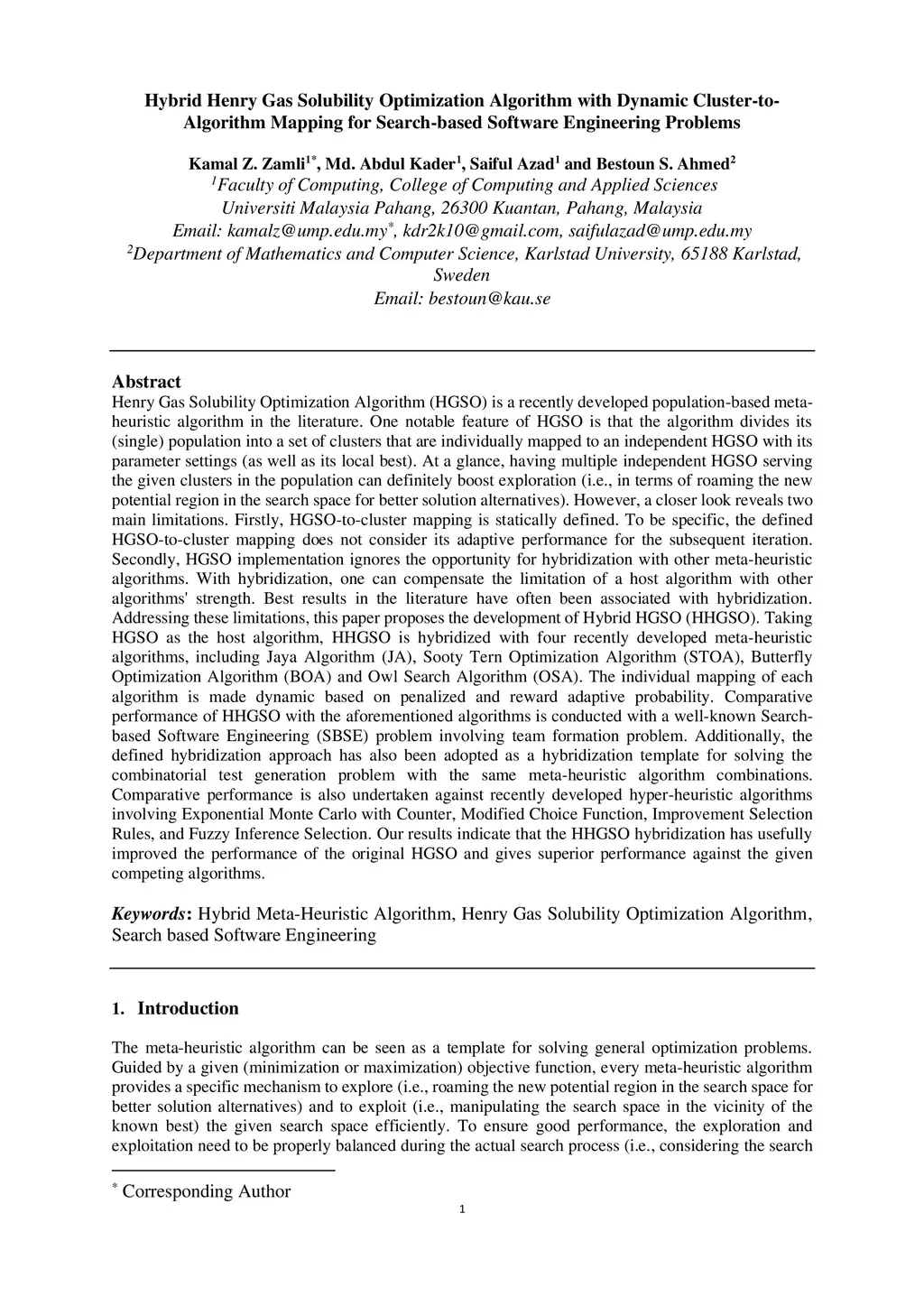 This paper discusses a new variant of the Henry Gas Solubility Optimization (HGSO) Algorithm, called Hybrid HGSO (HHGSO). Unlike its predecessor, HHGSO allows multiple clusters serving different individual meta-heuristic algorithms (i.e., with its own defined parameters and local best) to coexist within the same population. Exploiting the dynamic cluster-to-algorithm mapping via penalized and reward model with adaptive switching factor, HHGSO offers a novel approach for meta-heuristic hybridization consisting of Jaya Algorithm, Sooty Tern Optimization Algorithm, Butterfly Optimization Algorithm, and Owl Search Algorithm, respectively. The acquired results from the selected two case studies (i.e., involving team formation problem and combinatorial test suite generation) indicate that the hybridization has notably improved the performance of HGSO and gives superior performance against other competing meta-heuristic and hyper-heuristic algorithms.
