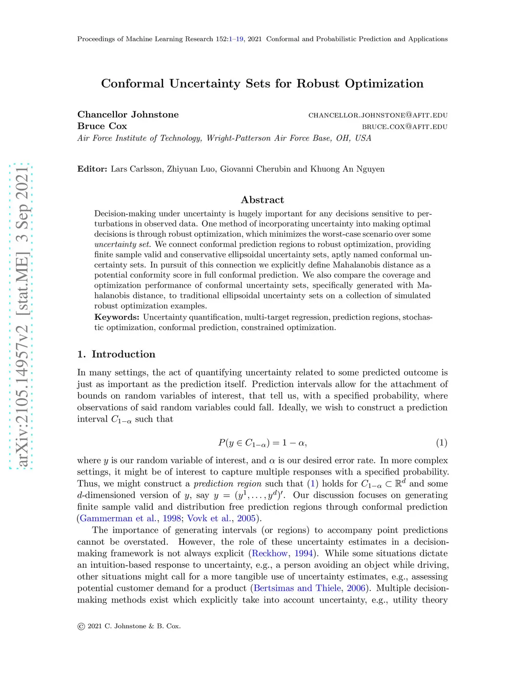 Decision-making under uncertainty is hugely important for any decisions sensitive to perturbations in observed data. One method of incorporating uncertainty into making optimal decisions is through robust optimization, which minimizes the worst-case scenario over some uncertainty set. We explore Mahalanobis distance as a novel function for multi-target regression and the construction of joint prediction regions. We also connect conformal prediction regions to robust optimization, providing finite sample valid and conservative uncertainty sets, aptly named conformal uncertainty sets. We compare the coverage and efficiency of the conformal prediction regions generated with Mahalanobis distance to other conformal prediction regions. We also construct a small robust optimization example to compare conformal uncertainty sets to those constructed under the assumption of normality.