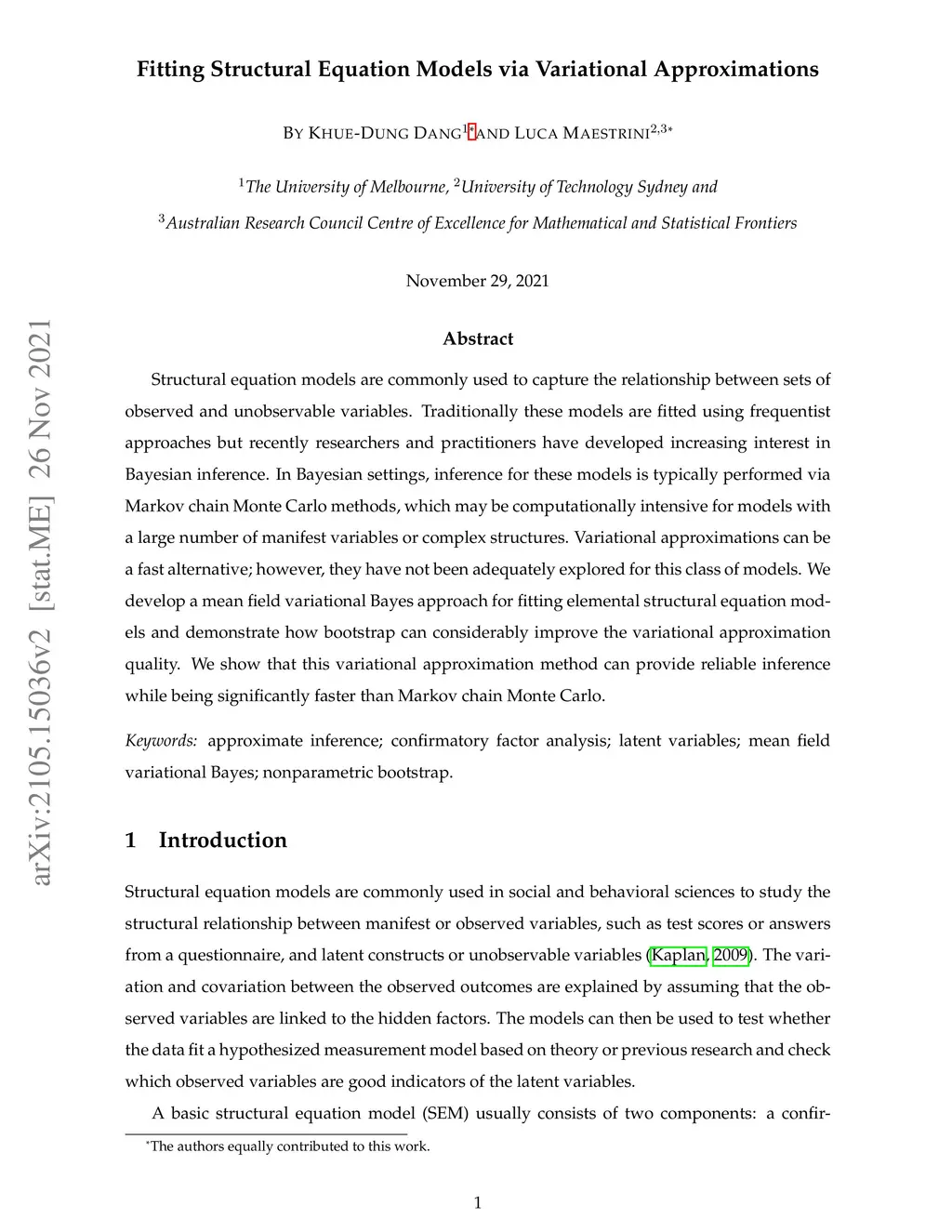 Structural equation models are commonly used to capture the relationship between sets of observed and unobservable variables. Traditionally these models are fitted using frequentist approaches but recently researchers and practitioners have developed increasing interest in Bayesian inference. In Bayesian settings, inference for these models is typically performed via Markov chain Monte Carlo methods, which may be computationally intensive for models with a large number of manifest variables or complex structures. Variational approximations can be a fast alternative; however, they have not been adequately explored for this class of models. We develop a mean field variational Bayes approach for fitting elemental structural equation models and demonstrate how bootstrap can considerably improve the variational approximation quality. We show that this variational approximation method can provide reliable inference while being significantly faster than Markov chain Monte Carlo.