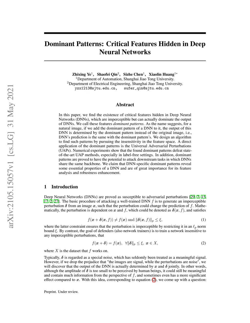 In this paper, we find the existence of critical features hidden in Deep NeuralNetworks (DNNs), which are imperceptible but can actually dominate the outputof DNNs. We call these features dominant patterns. As the name suggests, for a natural image, if we add the dominant pattern of a DNN to it, the output of this DNN is determined by the dominant pattern instead of the original image, i.e., DNN's prediction is the same with the dominant pattern's. We design an algorithm to find such patterns by pursuing the insensitivity in the feature space. A direct application of the dominant patterns is the Universal Adversarial Perturbations(UAPs). Numerical experiments show that the found dominant patterns defeat state-of-the-art UAP methods, especially in label-free settings. In addition, dominant patterns are proved to have the potential to attack downstream tasks in which DNNs share the same backbone. We claim that DNN-specific dominant patterns reveal some essential properties of a DNN and are of great importance for its feature analysis and robustness enhancement.