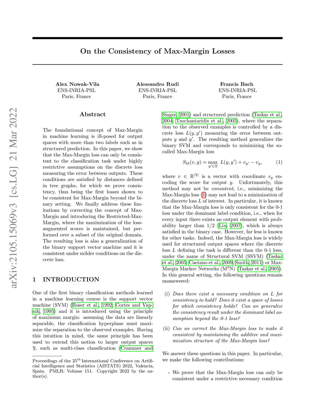 The foundational concept of Max-Margin in machine learning is ill-posed for output spaces with more than two labels such as in structured prediction. In this paper, we show that the Max-Margin loss can only be consistent to the classification task under highly restrictive assumptions on the discrete loss measuring the error between outputs. These conditions are satisfied by distances defined in tree graphs, for which we prove consistency, thus being the first losses shown to be consistent for Max-Margin beyond the binary setting. We finally address these limitations by correcting the concept of Max-Margin and introducing the Restricted-Max-Margin, where the maximization of the loss-augmented scores is maintained, but performed over a subset of the original domain. The resulting loss is also a generalization of the binary support vector machine and it is consistent under milder conditions on the discrete loss.