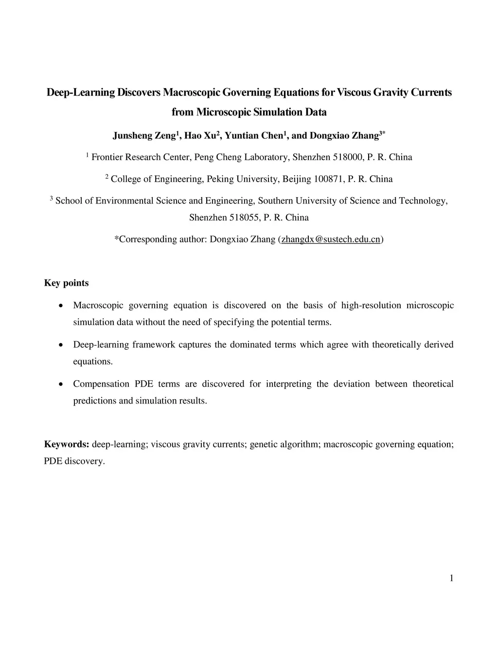 Although deep-learning has been successfully applied in a variety of science and engineering problems owing to its strong high-dimensional nonlinear mapping capability, it is of limited use in scientific knowledge discovery. In this work, we propose a deep-learning based framework to discover the macroscopic governing equation of viscous gravity current based on high-resolution microscopic simulation data without the need for prior knowledge of underlying terms. For two typical scenarios with different viscosity ratios, the deep-learning based equations exactly capture the same dominated terms as the theoretically derived equations for describing long-term asymptotic behaviors, which validates the proposed framework. Unknown macroscopic equations are then obtained for describing short-term behaviors, and additional deep-learned compensation terms are eventually discovered. Comparison of posterior tests shows that the deep-learning based PDEs actually perform better than the theoretically derived PDEs in predicting evolving viscous gravity currents for both long-term and short-term regimes. Moreover, the proposed framework is proven to be very robust against non-biased data noise for training, which is up to 20%. Consequently, the presented deep-learning framework shows considerable potential for discovering unrevealed intrinsic laws in scientific semantic space from raw experimental or simulation results in data space.