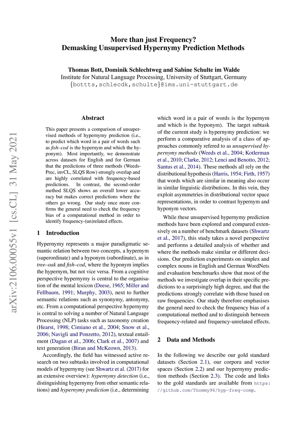 This paper presents a comparison of unsupervised methods of hypernymy prediction (i.e., to predict which word in a pair of words such as fish-cod is the hypernym and which the hyponym). Most importantly, we demonstrate across datasets for English and for German that the predictions of three methods (WeedsPrec, invCL, SLQS Row) strongly overlap and are highly correlated with frequency-based predictions. In contrast, the second-order method SLQS shows an overall lower accuracy but makes correct predictions where the others go wrong. Our study once more confirms the general need to check the frequency bias of a computational method in order to identify frequency-(un)related effects.