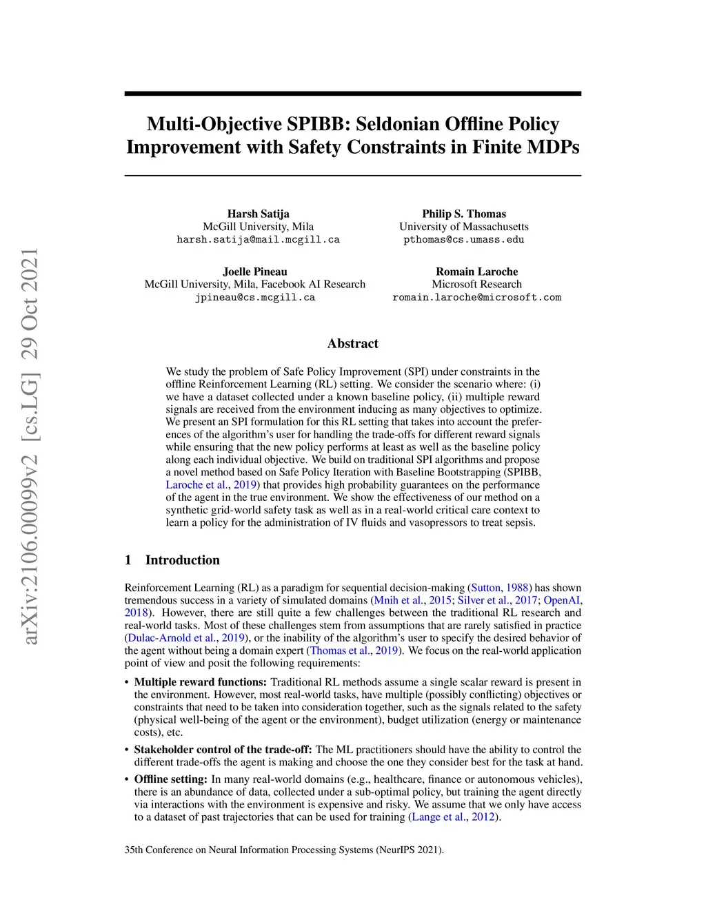 We study the problem of Safe Policy Improvement (SPI) under constraints in the offline Reinforcement Learning (RL) setting. We consider the scenario where: (i) we have a dataset collected under a known baseline policy, (ii) multiple reward signals are received from the environment inducing as many objectives to optimize. We present an SPI formulation for this RL setting that takes into account the preferences of the algorithm's user for handling the trade-offs for different reward signals while ensuring that the new policy performs at least as well as the baseline policy along each individual objective. We build on traditional SPI algorithms and propose a novel method based on Safe Policy Iteration with Baseline Bootstrapping (SPIBB, Laroche et al., 2019) that provides high probability guarantees on the performance of the agent in the true environment. We show the effectiveness of our method on a synthetic grid-world safety task as well as in a real-world critical care context to learn a policy for the administration of IV fluids and vasopressors to treat sepsis.