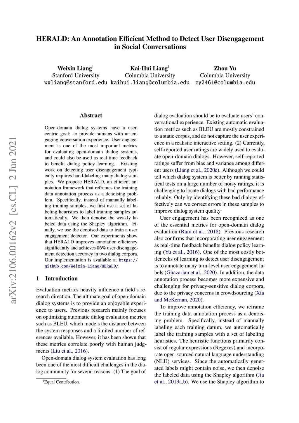 HERALD: An Annotation Efficient Method to Detect User Disengagement in