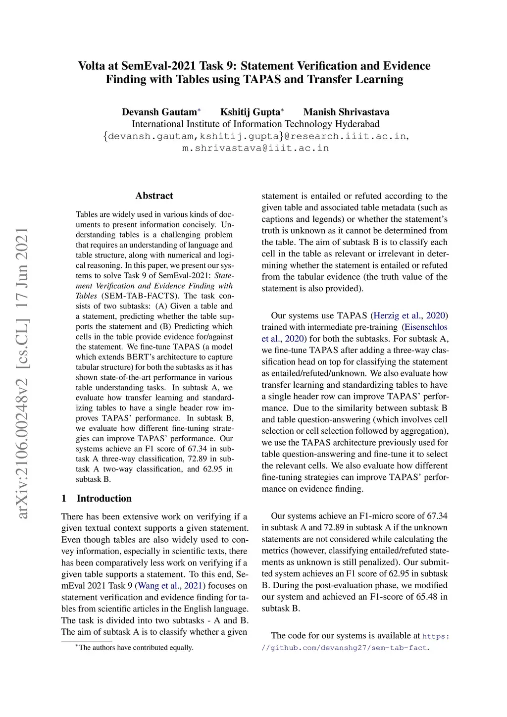 Volta at SemEval-2021 Task 9: Statement Verification and Evidence