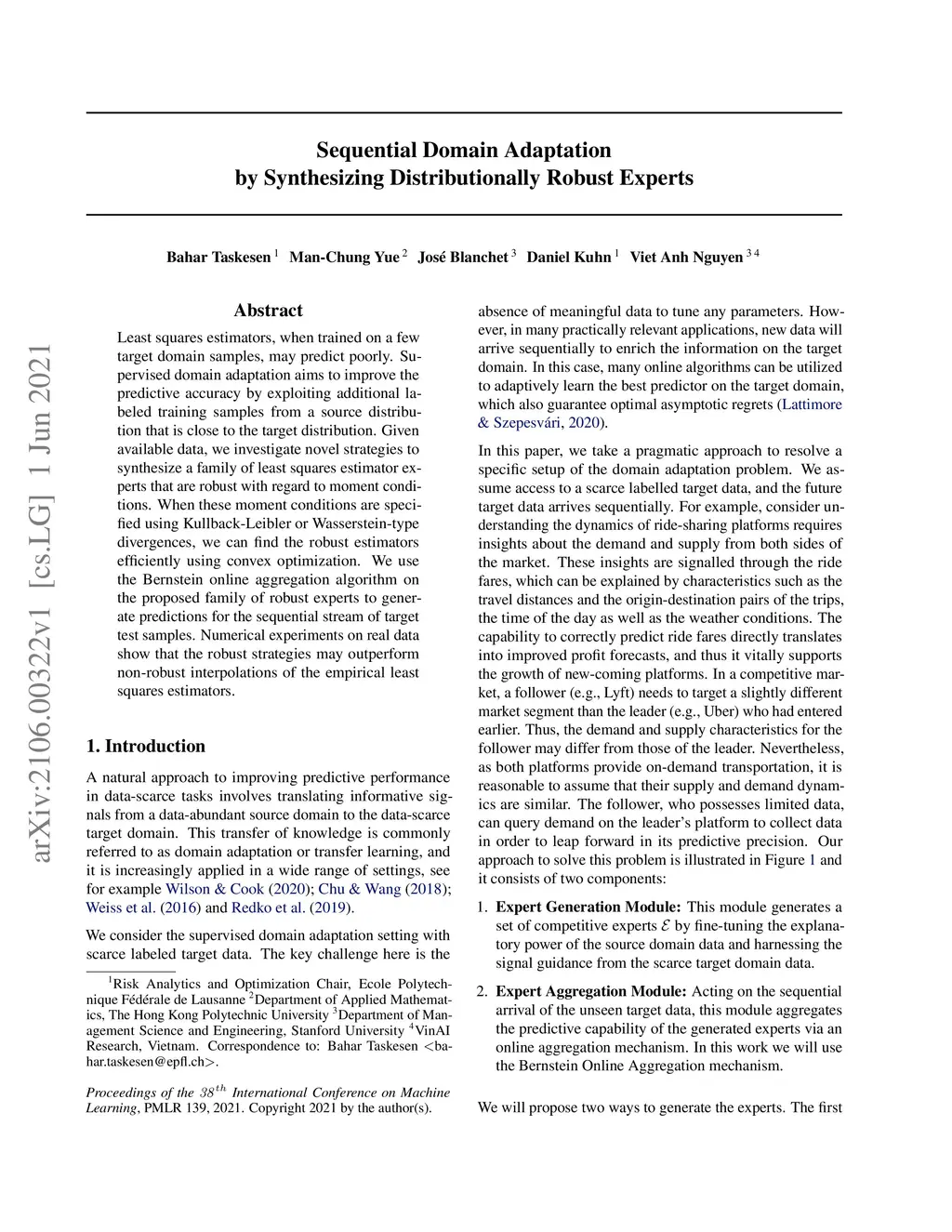 Least squares estimators, when trained on a few target domain samples, may predict poorly. Supervised domain adaptation aims to improve the predictive accuracy by exploiting additional labeled training samples from a source distribution that is close to the target distribution. Given available data, we investigate novel strategies to synthesize a family of least squares estimator experts that are robust with regard to moment conditions. When these moment conditions are specified using Kullback-Leibler or Wasserstein-type divergences, we can find the robust estimators efficiently using convex optimization. We use the Bernstein online aggregation algorithm on the proposed family of robust experts to generate predictions for the sequential stream of target test samples. Numerical experiments on real data show that the robust strategies may outperform non-robust interpolations of the empirical least squares estimators.
