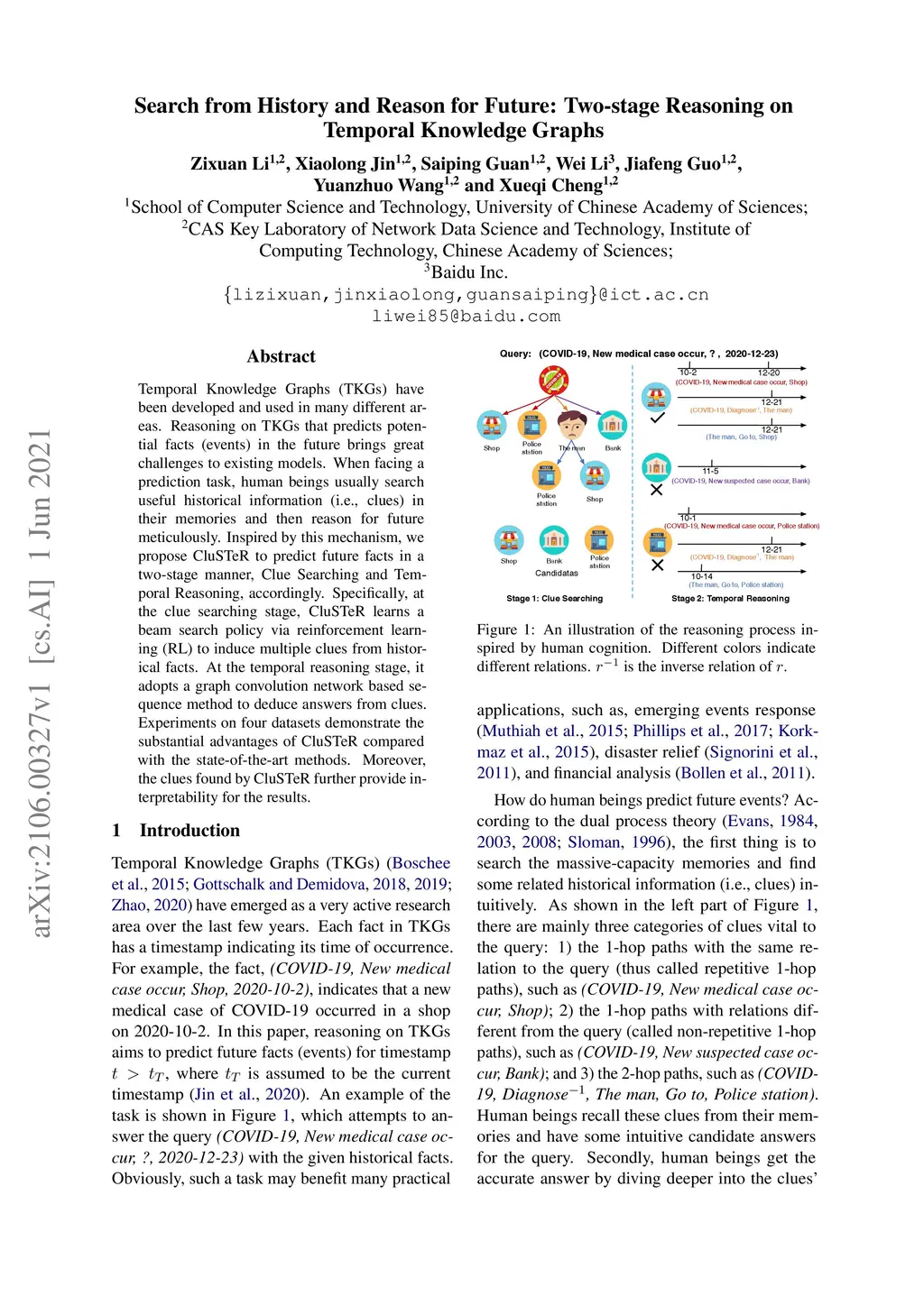 Temporal Knowledge Graphs (TKGs) have been developed and used in many different areas. Reasoning on TKGs that predicts potential facts (events) in the future brings great challenges to existing models. When facing a prediction task, human beings usually search useful historical information (i.e., clues) in their memories and then reason for future meticulously. Inspired by this mechanism, we propose CluSTeR to predict future facts in a two-stage manner, Clue Searching and Temporal Reasoning, accordingly. Specifically, at the clue searching stage, CluSTeR learns a beam search policy via reinforcement learning (RL) to induce multiple clues from historical facts. At the temporal reasoning stage, it adopts a graph convolution network based sequence method to deduce answers from clues. Experiments on four datasets demonstrate the substantial advantages of CluSTeR compared with the state-of-the-art methods. Moreover, the clues found by CluSTeR further provide interpretability for the results.