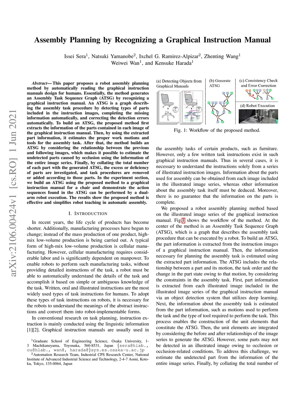 This paper proposes a robot assembly planning method by automatically reading the graphical instruction manuals design for humans. Essentially, the method generates an Assembly Task Sequence Graph (ATSG) by recognizing a graphical instruction manual. An ATSG is a graph describing the assembly task procedure by detecting types of parts included in the instruction images, completing the missing information automatically, and correcting the detection errors automatically. To build an ATSG, the proposed method first extracts the information of the parts contained in each image of the graphical instruction manual. Then, by using the extracted part information, it estimates the proper work motions and tools for the assembly task. After that, the method builds an ATSG by considering the relationship between the previous and following images, which makes it possible to estimate the undetected parts caused by occlusion using the information of the entire image series. Finally, by collating the total number of each part with the generated ATSG, the excess or deficiency of parts are investigated, and task procedures are removed or added according to those parts. In the experiment section, we build an ATSG using the proposed method to a graphical instruction manual for a chair and demonstrate the action sequences found in the ATSG can be performed by a dual-arm robot execution. The results show the proposed method is effective and simplifies robot teaching in automatic assembly.