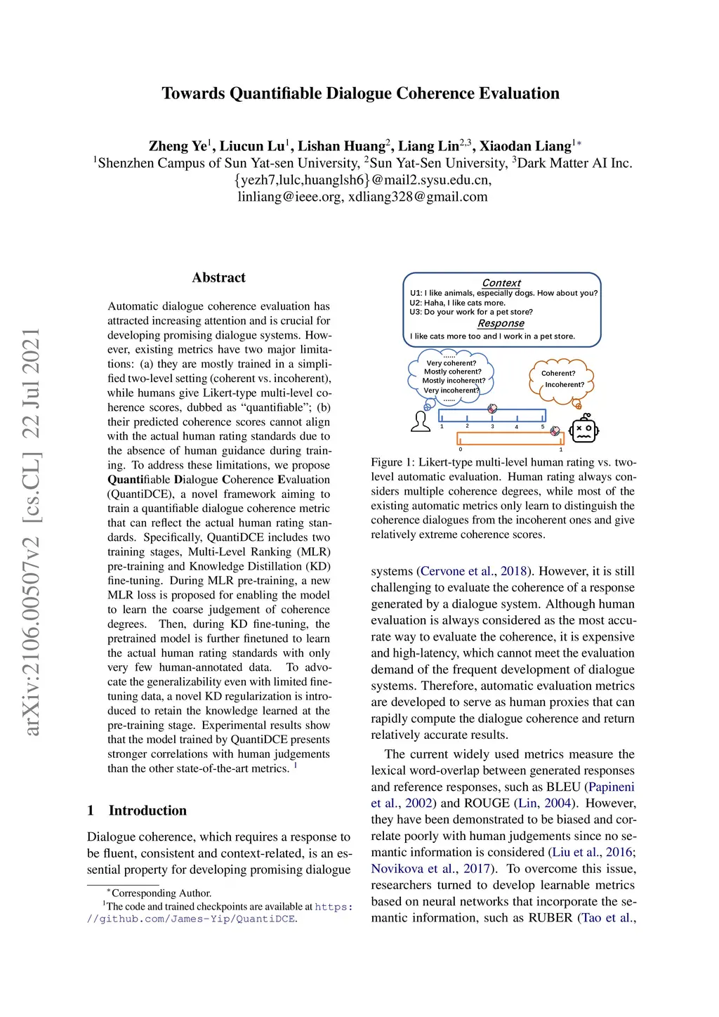 Automatic dialogue coherence evaluation has attracted increasing attention and is crucial for developing promising dialogue systems. However, existing metrics have two major limitations: (a) they are mostly trained in a simplified two-level setting (coherent vs. incoherent), while humans give Likert-type multi-level coherence scores, dubbed as "quantifiable"; (b) their predicted coherence scores cannot align with the actual human rating standards due to the absence of human guidance during training. To address these limitations, we propose Quantifiable Dialogue Coherence Evaluation (QuantiDCE), a novel framework aiming to train a quantifiable dialogue coherence metric that can reflect the actual human rating standards. Specifically, QuantiDCE includes two training stages, Multi-Level Ranking (MLR) pre-training and Knowledge Distillation (KD) fine-tuning. During MLR pre-training, a new MLR loss is proposed for enabling the model to learn the coarse judgement of coherence degrees. Then, during KD fine-tuning, the pretrained model is further finetuned to learn the actual human rating standards with only very few human-annotated data. To advocate the generalizability even with limited fine-tuning data, a novel KD regularization is introduced to retain the knowledge learned at the pre-training stage. Experimental results show that the model trained by QuantiDCE presents stronger correlations with human judgements than the other state-of-the-art metrics.