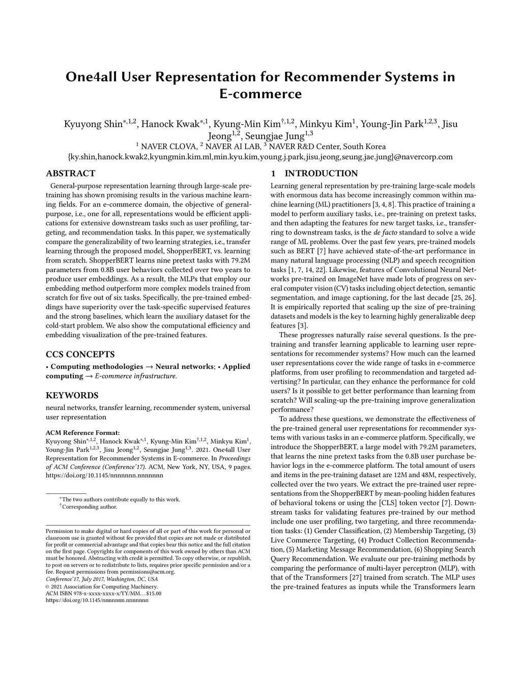 General-purpose representation learning through large-scale pre-training has shown promising results in the various machine learning fields. For an e-commerce domain, the objective of general-purpose, i.e., one for all, representations would be efficient applications for extensive downstream tasks such as user profiling, targeting, and recommendation tasks. In this paper, we systematically compare the generalizability of two learning strategies, i.e., transfer learning through the proposed model, ShopperBERT, vs. learning from scratch. ShopperBERT learns nine pretext tasks with 79.2M parameters from 0.8B user behaviors collected over two years to produce user embeddings. As a result, the MLPs that employ our embedding method outperform more complex models trained from scratch for five out of six tasks. Specifically, the pre-trained embeddings have superiority over the task-specific supervised features and the strong baselines, which learn the auxiliary dataset for the cold-start problem. We also show the computational efficiency and embedding visualization of the pre-trained features.