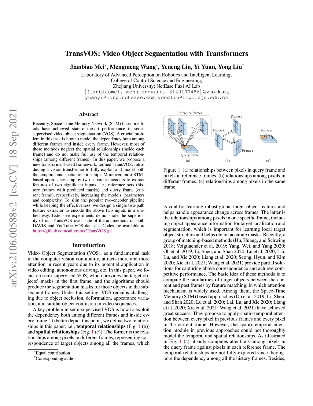 Recently, Space-Time Memory Network (STM) based methods have achieved state-of-the-art performance in semi-supervised video object segmentation (VOS). A crucial problem in this task is how to model the dependency both among different frames and inside every frame. However, most of these methods neglect the spatial relationships (inside each frame) and do not make full use of the temporal relationships (among different frames). In this paper, we propose a new transformer-based framework, termed TransVOS, introducing a vision transformer to fully exploit and model both the temporal and spatial relationships. Moreover, most STM-based approaches employ two separate encoders to extract features of two significant inputs, i.e., reference sets (history frames with predicted masks) and query frame (current frame), respectively, increasing the models' parameters and complexity. To slim the popular two-encoder pipeline while keeping the effectiveness, we design a single two-path feature extractor to encode the above two inputs in a unified way. Extensive experiments demonstrate the superiority of our TransVOS over state-of-the-art methods on both DAVIS and YouTube-VOS datasets.