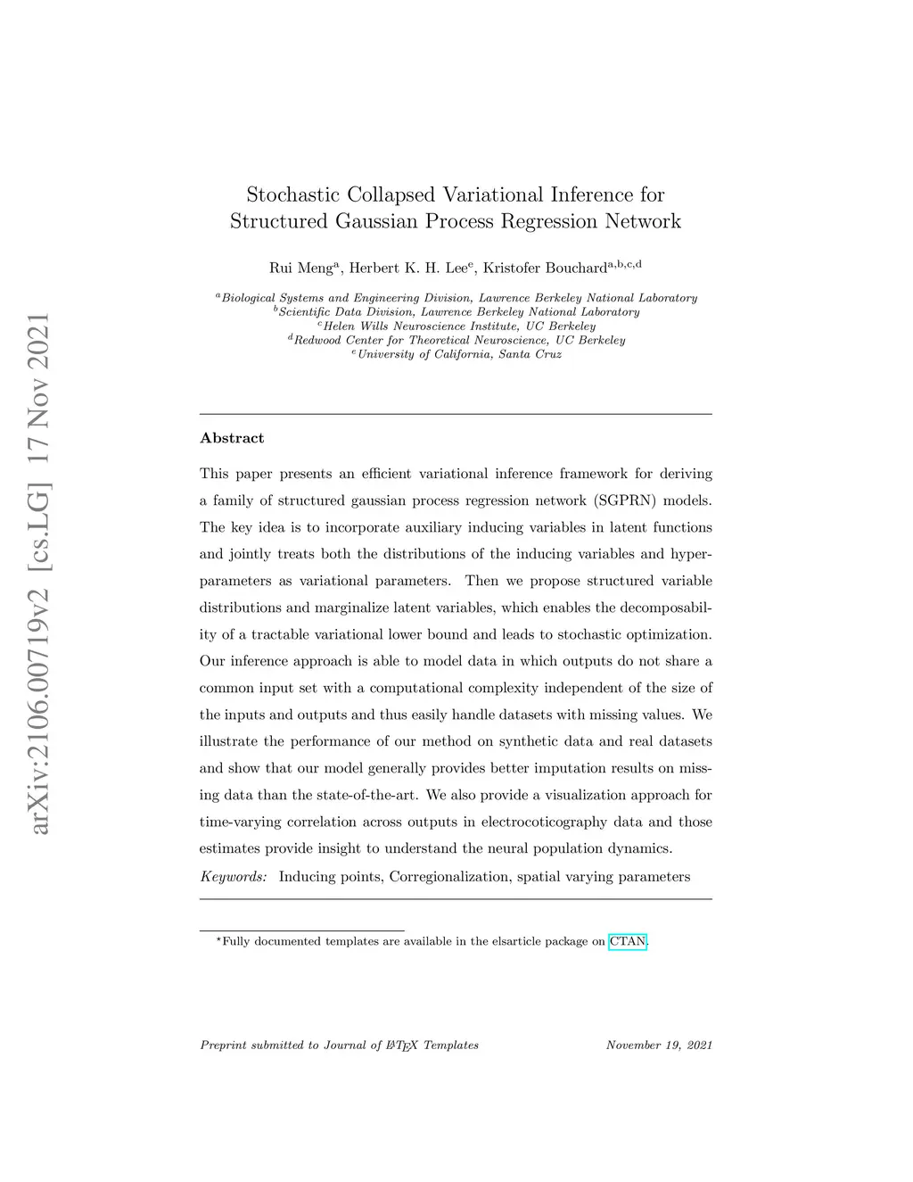 This paper presents an efficient variational inference framework for deriving a family of structured gaussian process regression network (SGPRN) models. The key idea is to incorporate auxiliary inducing variables in latent functions and jointly treats both the distributions of the inducing variables and hyper-parameters as variational parameters. Then we propose structured variable distributions and marginalize latent variables, which enables the decomposability of a tractable variational lower bound and leads to stochastic optimization. Our inference approach is able to model data in which outputs do not share a common input set with a computational complexity independent of the size of the inputs and outputs and thus easily handle datasets with missing values. We illustrate the performance of our method on synthetic data and real datasets and show that our model generally provides better imputation results on missing data than the state-of-the-art. We also provide a visualization approach for time-varying correlation across outputs in electrocoticography data and those estimates provide insight to understand the neural population dynamics.