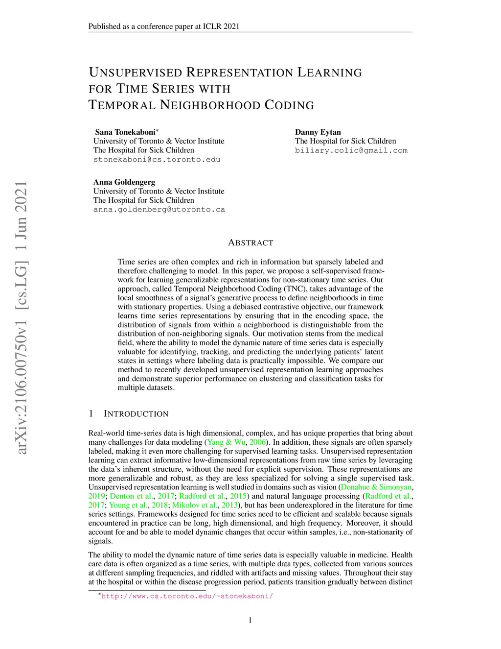 Time series are often complex and rich in information but sparsely labeled and therefore challenging to model. In this paper, we propose a self-supervised framework for learning generalizable representations for non-stationary time series. Our approach, called Temporal Neighborhood Coding (TNC), takes advantage of the local smoothness of a signal's generative process to define neighborhoods in time with stationary properties. Using a debiased contrastive objective, our framework learns time series representations by ensuring that in the encoding space, the distribution of signals from within a neighborhood is distinguishable from the distribution of non-neighboring signals. Our motivation stems from the medical field, where the ability to model the dynamic nature of time series data is especially valuable for identifying, tracking, and predicting the underlying patients' latent states in settings where labeling data is practically impossible. We compare our method to recently developed unsupervised representation learning approaches and demonstrate superior performance on clustering and classification tasks for multiple datasets.