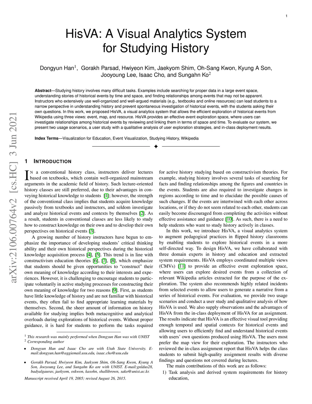 Studying history involves many difficult tasks. Examples include searching for proper data in a large event space, understanding stories of historical events by time and space, and finding relationships among events that may not be apparent. Instructors who extensively use well-organized and well-argued materials (e.g., textbooks and online resources) can lead students to a narrow perspective in understanding history and prevent spontaneous investigation of historical events, with the students asking their own questions. In this work, we proposed HisVA, a visual analytics system that allows the efficient exploration of historical events from Wikipedia using three views: event, map, and resource. HisVA provides an effective event exploration space, where users can investigate relationships among historical events by reviewing and linking them in terms of space and time. To evaluate our system, we present two usage scenarios, a user study with a qualitative analysis of user exploration strategies, and %expert feedback with in-class deployment results.