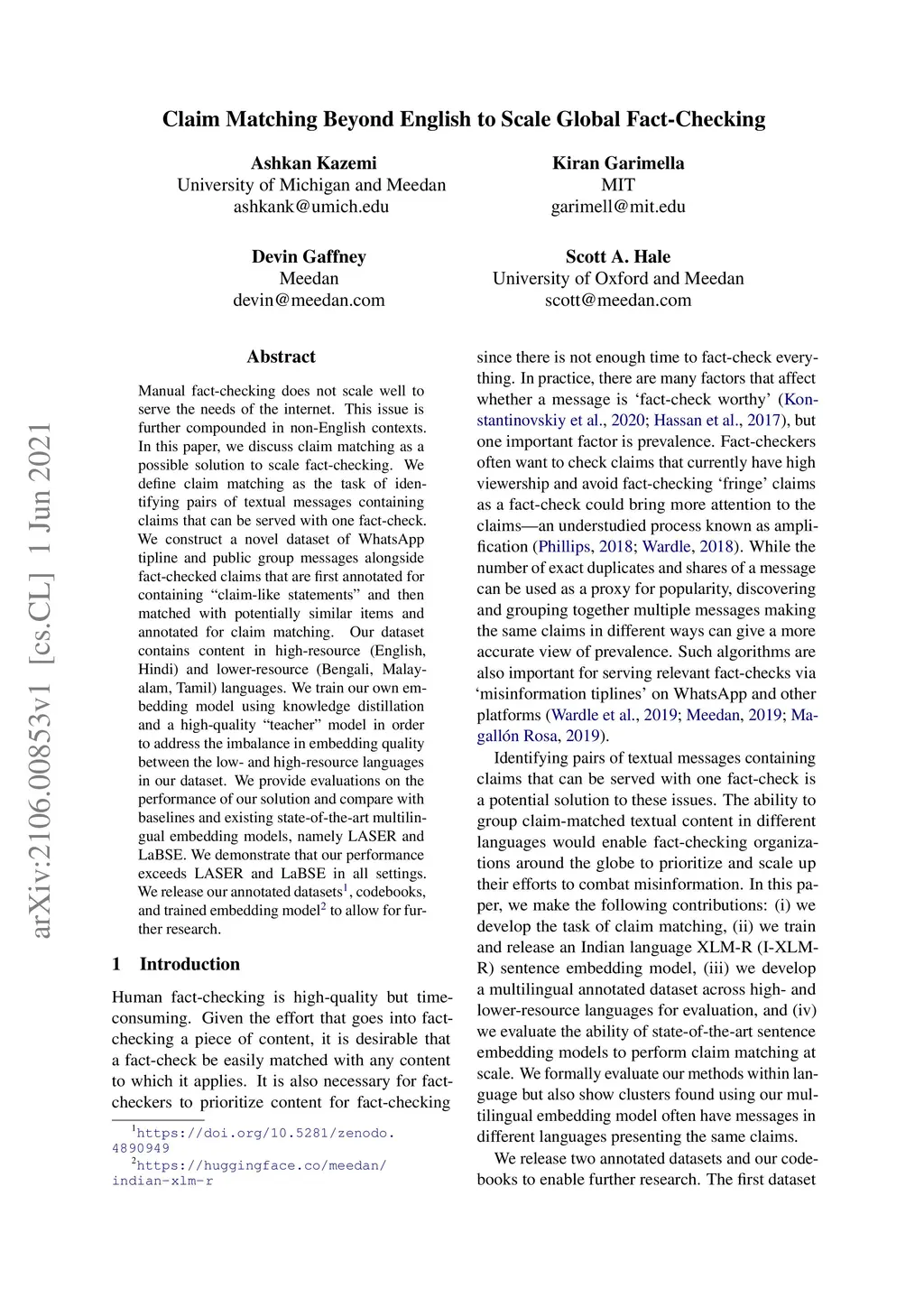 Manual fact-checking does not scale well to serve the needs of the internet. This issue is further compounded in non-English contexts. In this paper, we discuss claim matching as a possible solution to scale fact-checking. We define claim matching as the task of identifying pairs of textual messages containing claims that can be served with one fact-check. We construct a novel dataset of WhatsApp tipline and public group messages alongside fact-checked claims that are first annotated for containing "claim-like statements" and then matched with potentially similar items and annotated for claim matching. Our dataset contains content in high-resource (English, Hindi) and lower-resource (Bengali, Malayalam, Tamil) languages. We train our own embedding model using knowledge distillation and a high-quality "teacher" model in order to address the imbalance in embedding quality between the low- and high-resource languages in our dataset. We provide evaluations on the performance of our solution and compare with baselines and existing state-of-the-art multilingual embedding models, namely LASER and LaBSE. We demonstrate that our performance exceeds LASER and LaBSE in all settings. We release our annotated datasets, codebooks, and trained embedding model to allow for further research.