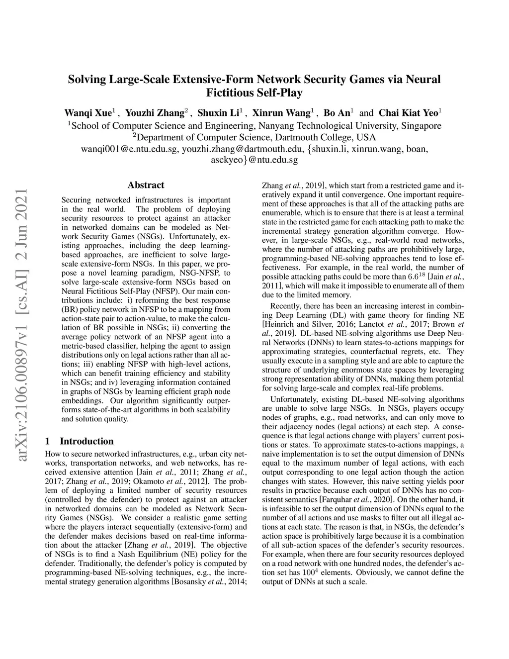 Securing networked infrastructures is important in the real world. The problem of deploying security resources to protect against an attacker in networked domains can be modeled as Network Security Games (NSGs). Unfortunately, existing approaches, including the deep learning-based approaches, are inefficient to solve large-scale extensive-form NSGs. In this paper, we propose a novel learning paradigm, NSG-NFSP, to solve large-scale extensive-form NSGs based on Neural Fictitious Self-Play (NFSP). Our main contributions include: i) reforming the best response (BR) policy network in NFSP to be a mapping from action-state pair to action-value, to make the calculation of BR possible in NSGs; ii) converting the average policy network of an NFSP agent into a metric-based classifier, helping the agent to assign distributions only on legal actions rather than all actions; iii) enabling NFSP with high-level actions, which can benefit training efficiency and stability in NSGs; and iv) leveraging information contained in graphs of NSGs by learning efficient graph node embeddings. Our algorithm significantly outperforms state-of-the-art algorithms in both scalability and solution quality.