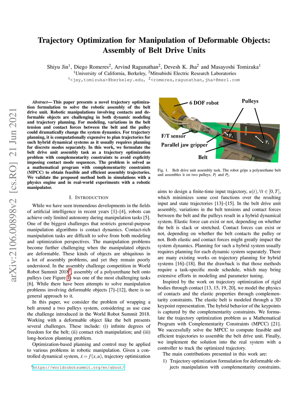 This paper presents a novel trajectory optimization formulation to solve the robotic assembly of the belt drive unit. Robotic manipulations involving contacts and deformable objects are challenging in both dynamic modeling and trajectory planning. For modeling, variations in the belt tension and contact forces between the belt and the pulley could dramatically change the system dynamics. For trajectory planning, it is computationally expensive to plan trajectories for such hybrid dynamical systems as it usually requires planning for discrete modes separately. In this work, we formulate the belt drive unit assembly task as a trajectory optimization problem with complementarity constraints to avoid explicitly imposing contact mode sequences. The problem is solved as a mathematical program with complementarity constraints (MPCC) to obtain feasible and efficient assembly trajectories. We validate the proposed method both in simulations with a physics engine and in real-world experiments with a robotic manipulator.