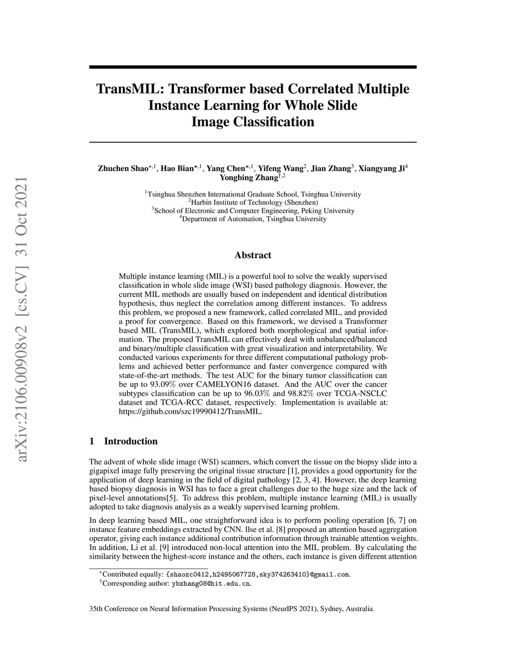 TransMIL: Transformer based Correlated Multiple Instance Learning for
