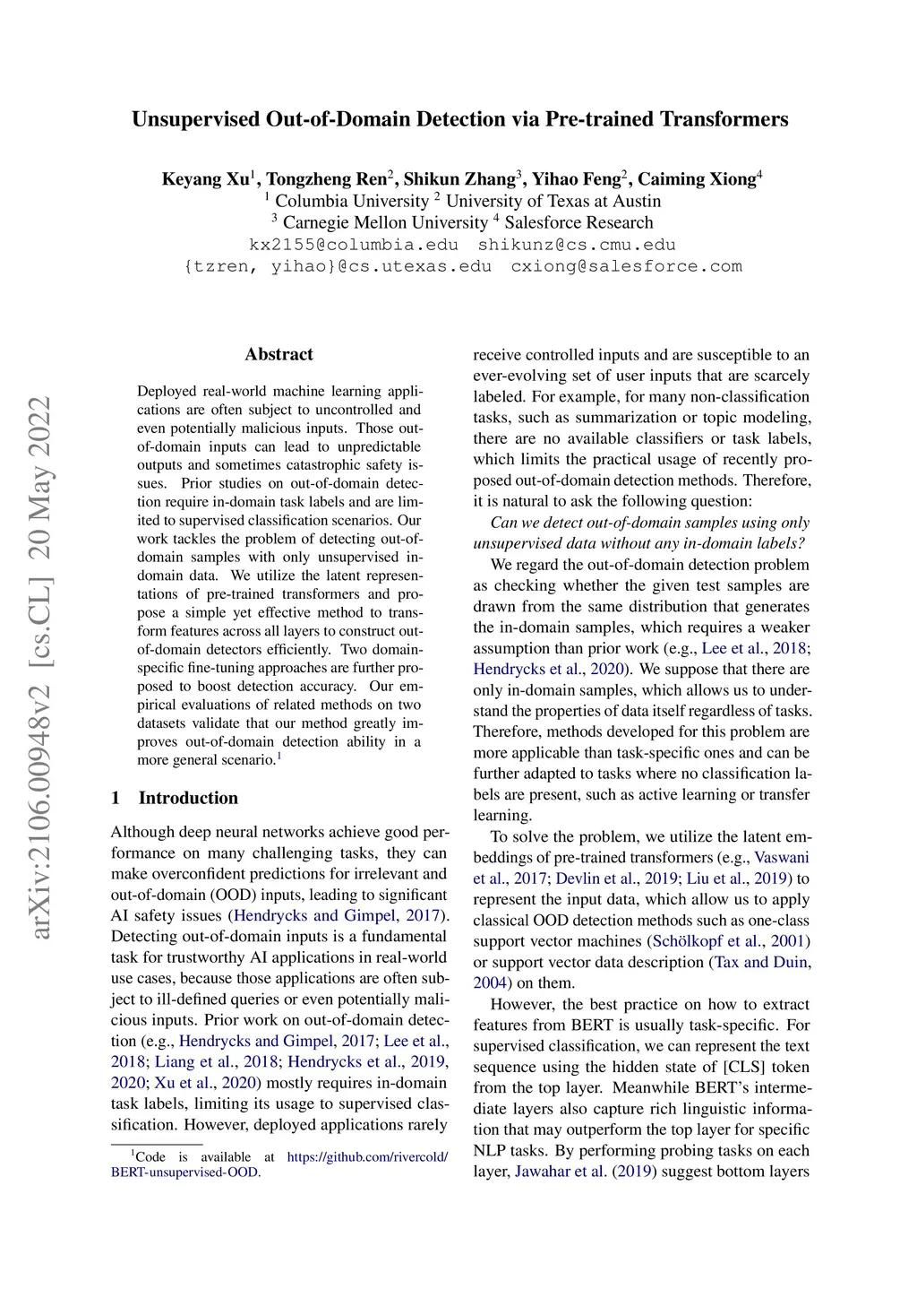 Unsupervised Out-of-Domain Detection via Pre-trained Transformers