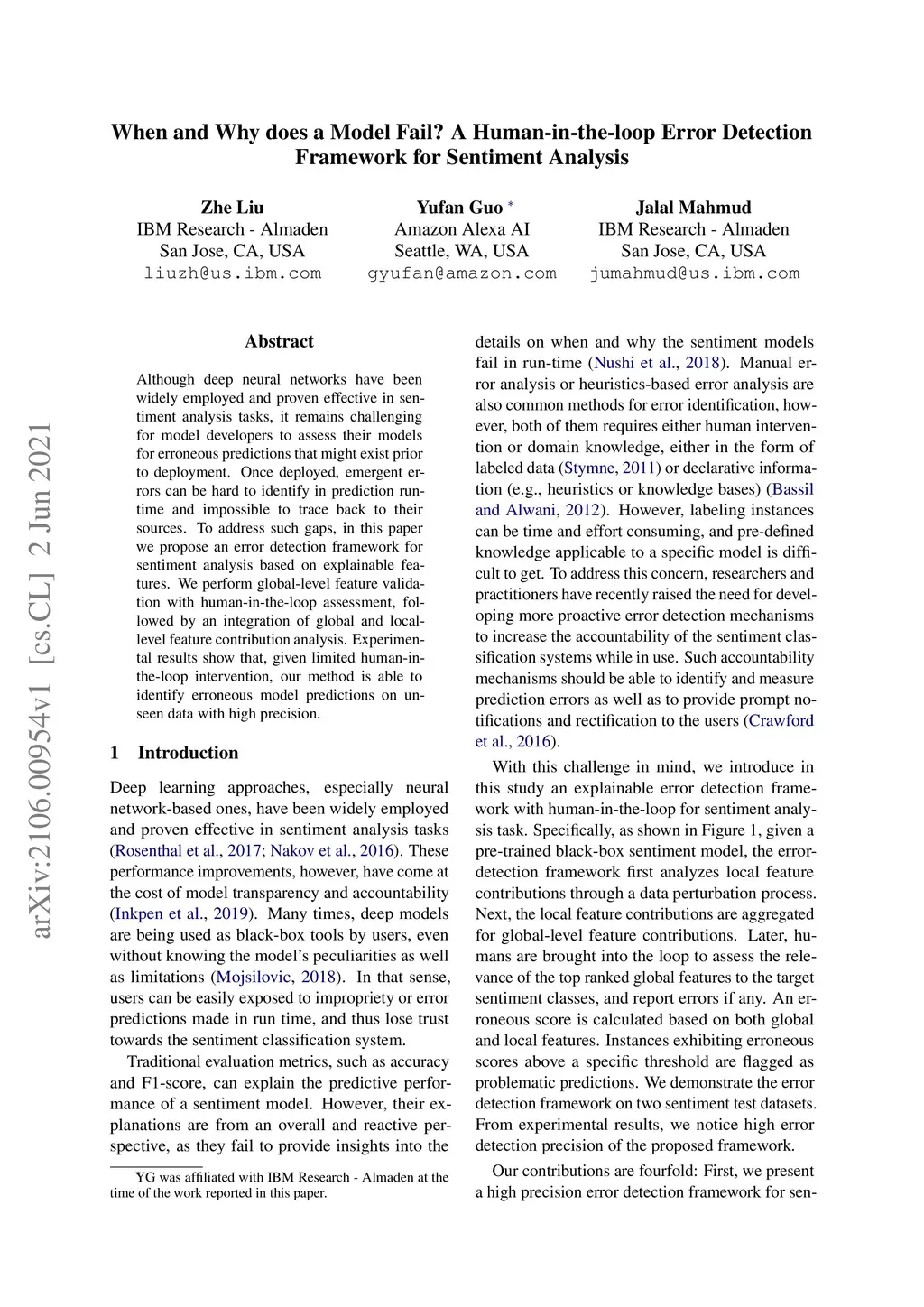Although deep neural networks have been widely employed and proven effective in sentiment analysis tasks, it remains challenging for model developers to assess their models for erroneous predictions that might exist prior to deployment. Once deployed, emergent errors can be hard to identify in prediction run-time and impossible to trace back to their sources. To address such gaps, in this paper we propose an error detection framework for sentiment analysis based on explainable features. We perform global-level feature validation with human-in-the-loop assessment, followed by an integration of global and local-level feature contribution analysis. Experimental results show that, given limited human-in-the-loop intervention, our method is able to identify erroneous model predictions on unseen data with high precision.